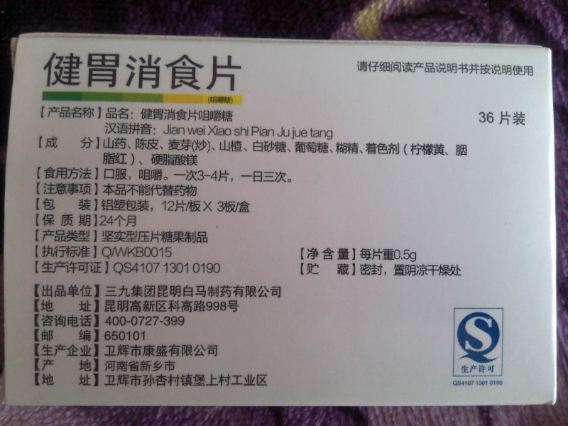 健胃消食片我很少买,也不知道哪种好?药店的人拿了几种给我,后来我就选择了这款三九的健胃消食片,主要还是看到上面有个小孩子的头像,想着这个小孩子应该是可以吃了,也看了下说明说可以的,我自己倒是没有吃过,我压根就不用消食啊,总是饿的很快,嘿嘿。。。 儿子吃了一颗在我的同意下又吃了一颗,看来挺好吃得,不然就算告诉他是糖,估计也不是很愿意吃,这款应该就是为孩子设计的,全名是:健胃消食片咀嚼糖。还特意注明各个年龄阶段的人各吃几颗,说的很是清楚。也说了忌生冷辛辣的食物,这个貌似每个药里面都会有说明的。