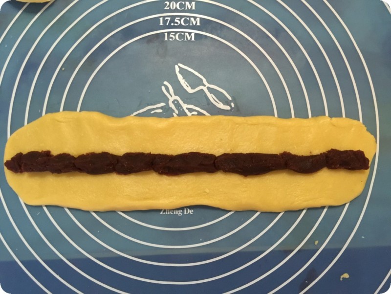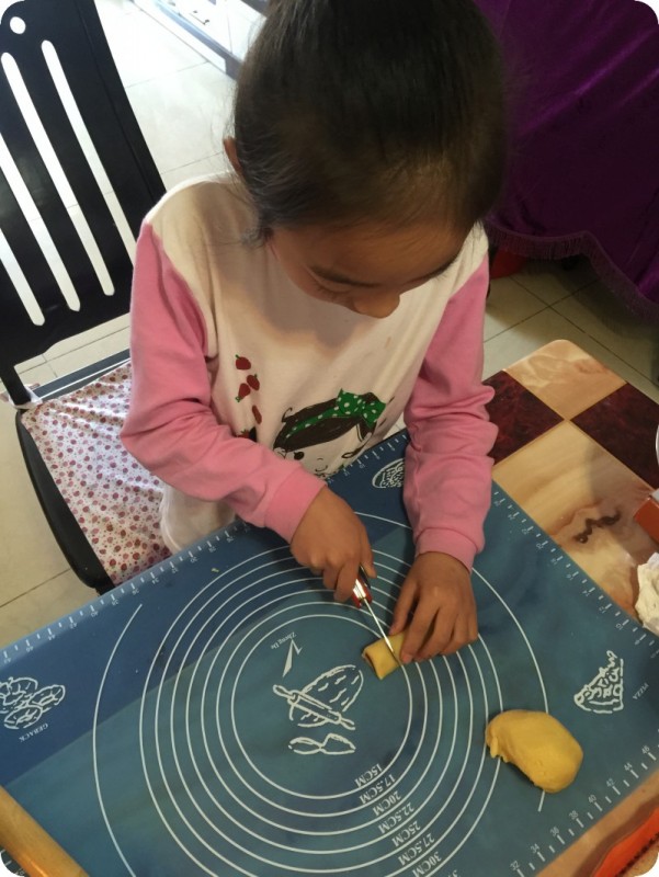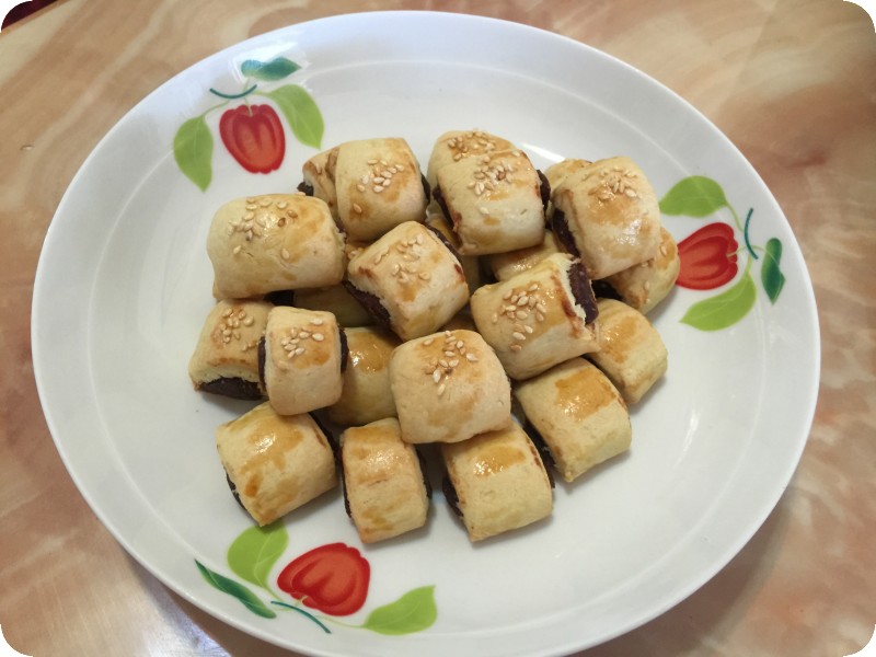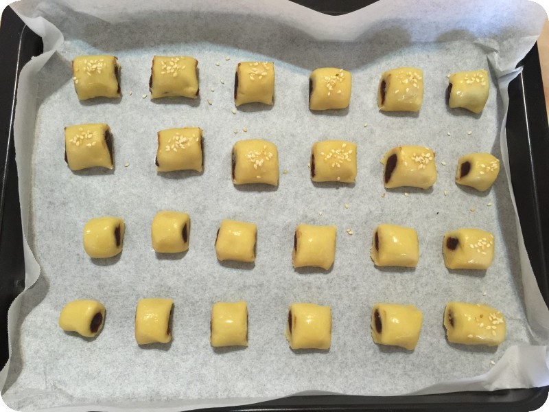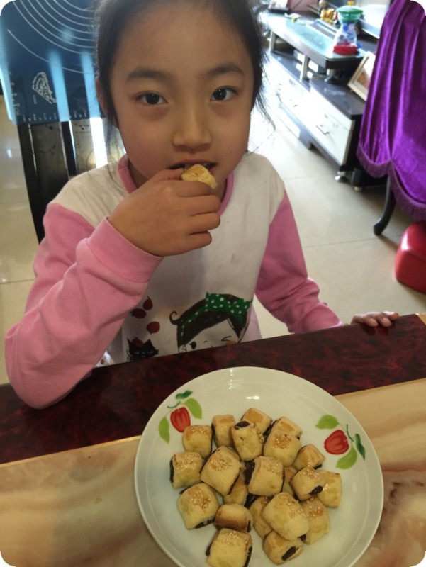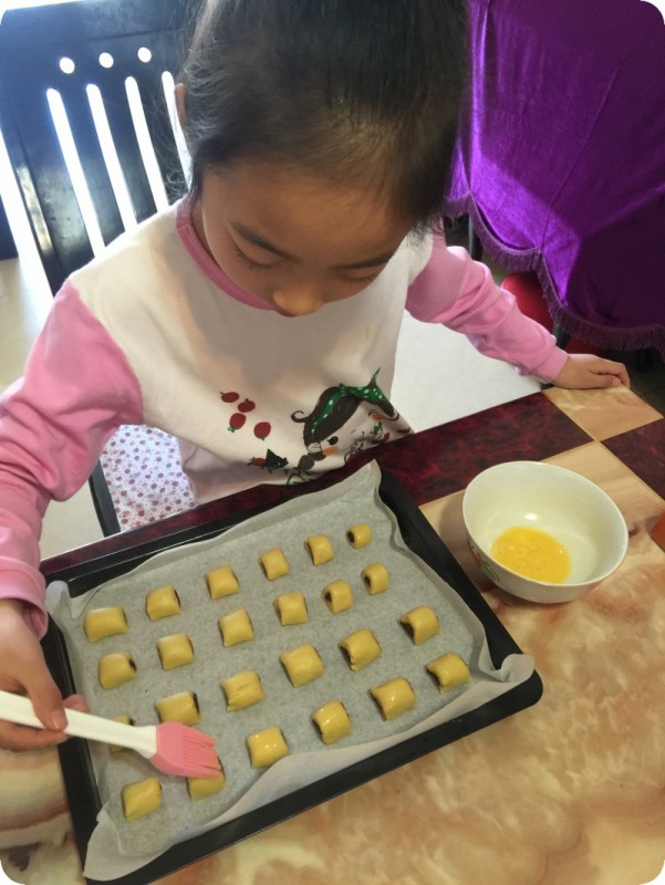 原料:低筋面粉100g,黄油50g,鸡蛋一个,糖粉15g。 步骤:1.黄油充分软化后,将黄油打发,加入糖粉,继续打,再加入40g蛋液,继续打,混合均匀; 2.筛入低筋面粉(我懒得筛,直接加入低粉,做出来也可以),先用刮刀搅拌,再上手揉成面团; 3.将面团分成两块,擀成长方形,加入豆沙,卷起来,切成小块; 4.每一块刷上蛋液,撒点白芝麻,放入烤箱,170度25分钟(烤箱温度各有不同,可适当调整)。 每一次做蛋糕饼干之类,贝贝都是我的好帮手,帮我拿各种需要的原料和工具,摆在桌子上。一些简单的操作,她都要亲手做一做,比如在这次做豆沙卷的时候,她打发黄油,把我卷好的豆沙卷长条切成小块,刷蛋液等,都是她来完成的。我第二次做时,她睡了,我自己刷的蛋液,别说,还真是不简单,刷多了就会流到油纸上,她刷的还真没有流下来。所以说,我们真得相信孩子,很多时候可以大胆的让他们参与进来,做多了就做好了。