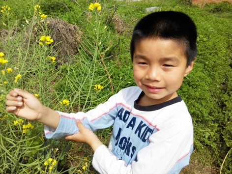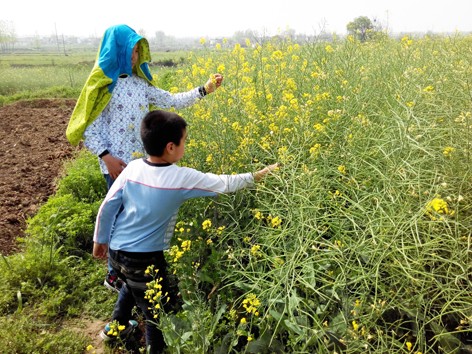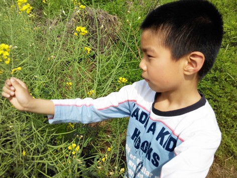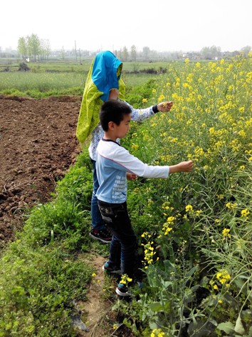 星期天我们回到了老家,晨晨很喜欢回老家,因为对他来说老家的什么东西都是新鲜的,而且还可以和表哥一起快乐的玩耍,所以非常的开心,当然我们来老家还有一个原因就是来看望可爱的小宝宝,大人们看小宝宝,而孩子们就已经找到了自己的乐趣,那就是在油菜花田中找蜜蜂啦,我想这就是男孩子和女孩子的区别吧,因为晨晨只要和表哥在一起,就玩起了男孩才喜欢玩的游戏。 现在的油菜花已经不像前一段时间开的那么的浓了,有的花瓣已经飘落了,不过还是能够看到满田的油菜花,并且这个油菜花田就是弟妹家门口,非常的方便,这样我只需要坐在弟妹家门口那里就可以看到孩子子,不用一直跟着他们,因为天气实在是太热了,一开始的时候,晨晨还穿着外套,不一会儿全脱啦,只有一个T恤了,就这样头上都是汗,我想这样的天气晒下来,晨晨那个皮肤又要黑一层了,需要什么时候才能够恢复好呀,晨晨喜欢和哥哥在一起,因为哥哥比晨晨大,会照顾他,还会带他玩,一开始的时候,他们看到很多蜜蜂在采蜜,根本没想到要抓蜜蜂,后来当晨晨摘下一朵油菜花的时候,发现竟然有蜜蜂追随着这几油菜花,于是哥哥突发奇想的就要抓蜜蜂了。