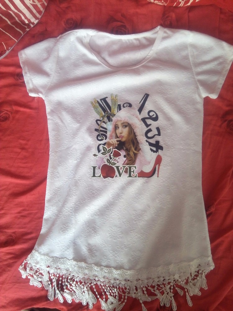 一到那我就直奔我之前看得那件短袖,原来不是两件套,看着像是两件的,但实际上两件肩膀部位是连在一起的,这个倒是很不错呢,就在我把那件短袖拿起来看看的时候,看到在后面还挂着一件短袖,咦,貌似也很不错哦。白色的衣服,面前有个女子的图案,还有玫瑰花作为陪衬,还有个LOVE的字样,居然还有红色的高跟鞋哦,嘻嘻,这个让我想到人比花娇这个词。这件衣服本来没有什么突出的,只是下摆处多了些虚虚挂挂的,这个无形中就为它加分了,看着好看但不乱,我很喜欢,就拿了后面的一件,两件套的那件短袖被我舍弃了。
