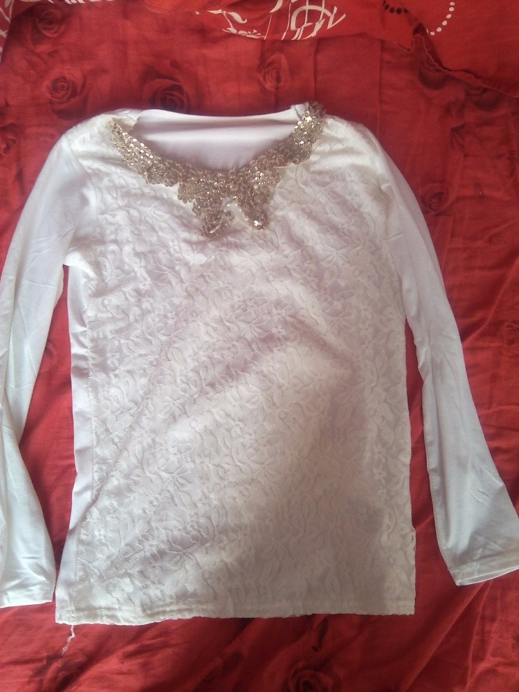 我妈抱着女儿,儿子和邻居家的孩子忙玩,人多车多我们还得看着这两孩子,孩子跑着,我们看着,还时不时得看看是否还有中意的衣服,后来就看到一件长袖,很多长袖挂在一起,我看中得这件面料感觉很柔软,再便宜穿着不舒服也是白搭,比较了一下就还是我先拿的这件好看,也是白色的,领口处还有珠子串起来的,看着有点像蝴蝶的样子,我一看到就喜欢上了,就是线头有点儿多,回家修下就可以了。
