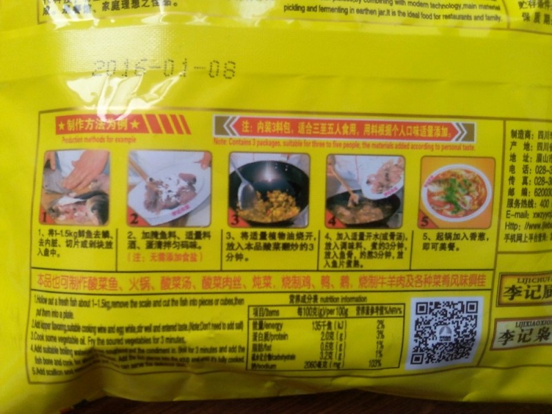 一包酸菜鱼调料包括酸菜包,调料包,腌料包,就我个人来说觉得酸菜比鱼好吃,哈哈,辣死了还想吃。配料也足啊,以前妈妈不会做酸菜鱼,后来看到有专门的酸菜鱼佐料就买了,而且包装上面也是配有说明的,怎么做都是很清楚的告诉你,这简直就是为什么都不会的人准备的啊。我都有一年没有吃了啊,之前怀二宝,说是酸菜鱼不能吃,我只能忍着看着家里人吃,现在女儿虽然是在哺乳期,这偶尔吃一次也没有什么关系吧,哈哈,晚上吃的真真是爽啊!