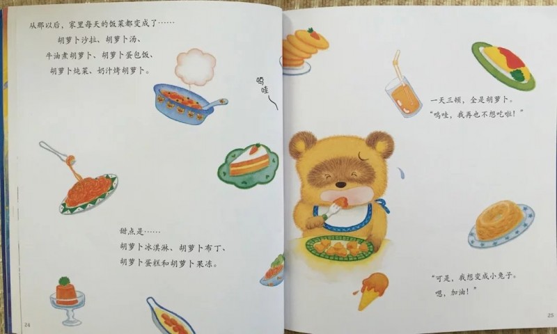 ![]() 《百变小狸猫》,看到这个题目,相信很多人会首先联想到中国的经典历史故事《狸猫换太子》。狸猫这种动物在中国是不多见的,而在日本却被奉为神灵。在日本,狸猫是一种非常神秘又讨人喜欢的小动物,和人类相处很是融洽。有很多的日本动画片和绘本都是以狸猫为题材的。我看到这本书名的第一时间想到的就是日本畅销绘本《开车出发系列》第二辑中《末班电车的奇怪乘客》里的故事,那里面的狸猫们就非常可爱,非常受人们欢迎和爱护。 ![]() 小家伙还小,无法理解这么复杂的文化背景,不过看到书中这位可爱的名叫‘空空’的小狸猫,他马上就被吸引住了。这个空空实在是太可爱了,金黄色的身体,黑黑的眼圈更显憨态可掬,脖子里还系着一条红围巾,真是太讨人喜欢了!当我念出空空想要找朋友玩的烦恼时,小家伙忍不住大叫着说:“空空,我们一起玩吧!”哈哈。 ![]() 书中的情节简单有趣,描述的是小狸猫空空为了能和小兔子们一起跳舞,想尽办法,经历种种失败,最后变身成功如愿以偿的故事。 狸猫大概是种独居的动物,平时没多少玩伴。孤单的空空在回家的路上发现了草丛后面正在欢快跳舞的小兔子们。他羡慕极了,很想和他们一起玩,可是又担心自己是狸猫而不受兔子们的欢迎。于是,他开始发功,用不同的叶子当道具,两眼紧闭,双手合十,口中念念有词。图画中还有烟雾冒出。看得小家伙也忍不住跟着学了起来:“哈哩哈哩空空........变成小兔子!”书里的小狸猫认真的样子可爱至极,书外的小家伙模仿的样子让人忍俊不禁。一本书无论能给人多少启发和美的享受,仅仅是让人能感受到欢乐就已经算得上一本好书! ![]() 可是,不幸的是无论空空多么努力,变来变去,就是不成功。不是耳朵没变好,就是尾巴没变化,还有那黑黑的眼圈就是变不掉。空空试了一遍又一遍,却越变越糟。空空反复变化前后的样子对比,小家伙和我居然都可以当‘找不同’游戏了。哈哈,真是一书多用啊! ![]() 怎样才能成功呢?空空睡觉都在苦思冥想。第二天早上他要求妈妈以后每天都给他做胡萝卜吃,那可是他平时最不爱吃的食材啊!虽然很纳闷,但是狸猫妈妈还是每天都变着花样给空空用胡萝卜做出了五花八门的饭菜。哇,胡萝卜沙拉、胡萝卜蛋包饭.....胡萝卜冰激凌、胡萝卜果冻......,一日三餐,主食、甜点、饮料,全部都是胡萝卜做的!这狸猫妈妈真是太有才了!一种食材就可以做出这么多不同的美味来,那不同的食材岂不是.....。作为一个妈妈,我很惭愧啊,这下可要好好学习下了,也给我的宝贝每天都作出不同的花样来。 ![]() 终于变身成功的空空如愿以偿地混进了兔子队伍,和小兔子们一起欢快地跳起舞来。可是因为高兴过了头,居然连自己变回原形了都不知道。空空左右两边的小兔子都露出惊吓的表情,不过这并不影响他们一起玩。书的最后,是一副美丽而美好的画面。宝蓝色的夜空悬挂着一轮金灿灿的满月,就像一盏巨大的灯,为草地上欢快地跳舞的小动物们照着亮。只见舞池中不知什么时候又多了两只小狸猫,而戴着红丝巾的空空正在中间玩得开心呢!哈哈,看来和空空一样心思的小狸猫还不少。不过事实证明小兔子们并没有因为他们不是同类而排斥他们。 ![]() 书中在空空第一次发现小兔子们和玩得开心变回原形这两个情节高潮处精心设计了折叠页,巧妙的折叠页设计增加了故事的趣味性和神秘性,更加吸引孩子们的注意力。 ![]() ![]() ![]() 为了和小兔子一起玩,空空可真是拼啊!大概只有小孩子才能真正体会这种心情了!现在的孩子大多是独生子女,平时又要上学,可以痛痛快快一起玩的朋友真是不多,就像书中的空空一样。而且因为各种原因,现在的家长都比较警惕,经常告诫孩子不要随便跟陌生人说话,不要随便跟陌生小朋友玩等。被告诫和约束的多了,孩子们也会在社交方面比较被动,害怕被拒绝,就跟书中的空空一样。其实,孩子们的心是最单纯的,喜欢就要大声说出来!如果空空在第一次遇到小兔子们的时候就大方地告诉他们他也想和他们一起玩,也许就不用费那么大劲儿变身和天天逼自己吃胡萝卜了。我们家这个小家伙在生活中也发生过类似空空这种情况,想跟人家玩又害怕被拒绝。相信看了这本书后他会变得更加主动更加友好了。 这本书的插画也非常梦幻、非常唯美,看得小家伙也不停地赞叹:“哇,太美了,这晚霞好美啊!我明天要把它们都画下来,你能帮我吗,妈妈?”当然没问题了,宝贝! 本作品未经作者许可不得转载,转载请征求作者意见。擅自转载使用,将保留追究其法律责任的权利! 个性签名