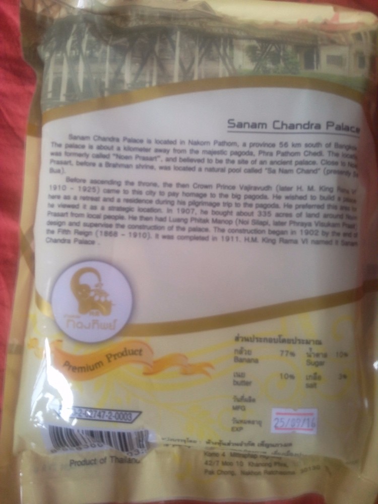 这两样从泰国带回来的小零食,芝麻米果还好,上面有标签贴上了中文,而那袋子芭蕉片上面的文字我都不认识的,我只认识中文啊。 本作品未经作者许可不得转载,转载请征求作者意见。擅自转载使用,将保留追究其法律责任的权利! 评分记录