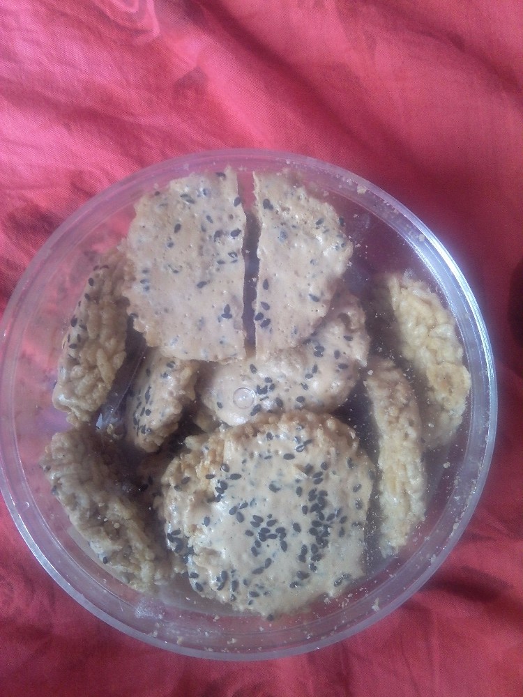 我看了一下,两样吃的,一样是芭蕉片,我能说我一开始拿出来的时候以为就是香蕉皮吗,我还纳闷来着,这香蕉片我们这经常有的卖,怎么会带这个回来呢,再认真一看,原来是我自己看错了啊,一袋芭蕉片净重量是275克,烤的焦黄焦黄的,看着还是很诱人的,这刚好是午饭的时间,我还没有开,等下午吃吃看。还有一盒芝麻米果,这个只有120克,材料其实还挺简单的,就是面粉,芝麻那些个东西,看着就跟我们这里卖的芝麻饼差不多。