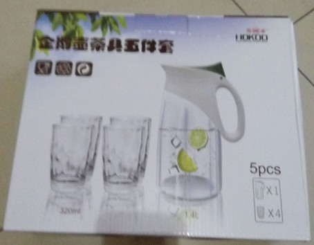 这是上一个月参加了公司的公益活动,也就是健身走活动,之前的时候领导就说了所有参加的人员都会免费送一个礼物,然后我们就等呀等呀,我还以为领导已经忘了这回事了呢,好在终于在上个星期的时候,我们的礼物发送到手里了,虽然和我们想象的不一样,我们还以为是什么日用品呢,不过这个茶具五件套还是不错的,特别是家里来客人的话会比较实用一些,反正是参加活动送的礼品,有总比没有要强的多,所以也算是不错的,到了夏天的时候,这个还是很有需要的,我们可以先把水放大杯子中,这样凉的时候就可以喝了。 在外面的包装上面也说了这个五件套,说是五件套,实际上就只有一个茶具和四个杯子而已,不过当我打开外面的盒子,看到里面的茶具的时候,还是发现挺漂亮的,这里的杯子和茶具都是玻璃材质的,我特别喜欢玻璃材质,因为它们无污染呢,而且茶具的大小也挺大的,是细细长长的类型,在茶具的里面还有着说明书,看起来还真是不错呀,茶具的盖子也是非常精致的,盖子是绿色的,然后在把手那里会有一个按钮,我们只需要按一下按钮就可以打开外面的盖子了,然后就可以倒入开水或者果法了。