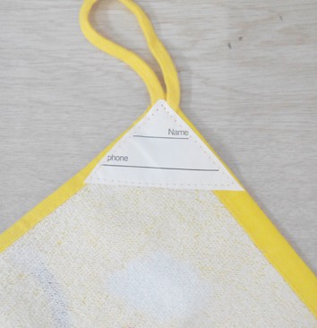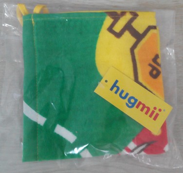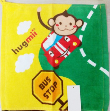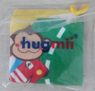 我把密封袋子打开里面的图案就呈现出来了,小方巾的色彩非常的亮丽,里面有一只可爱的小猴子,它正在开着小汽车,这真是男孩子最喜欢的小方巾了,因为男孩子喜欢汽车,而今年又是猴年,所以一看就是超级新的小方巾,色彩有黄色的、绿色的还有红色的,在小方巾的正面有着它们的商标,小方巾的背面还有着几行英语,原来这样的小方巾可以带到幼儿园或者学校去,因为上面可以写着自己的姓名和照片,这样的话就不会容易丢掉了,小方巾的上面还有一个挂钩可以挂着,真是设计的非常的贴心。