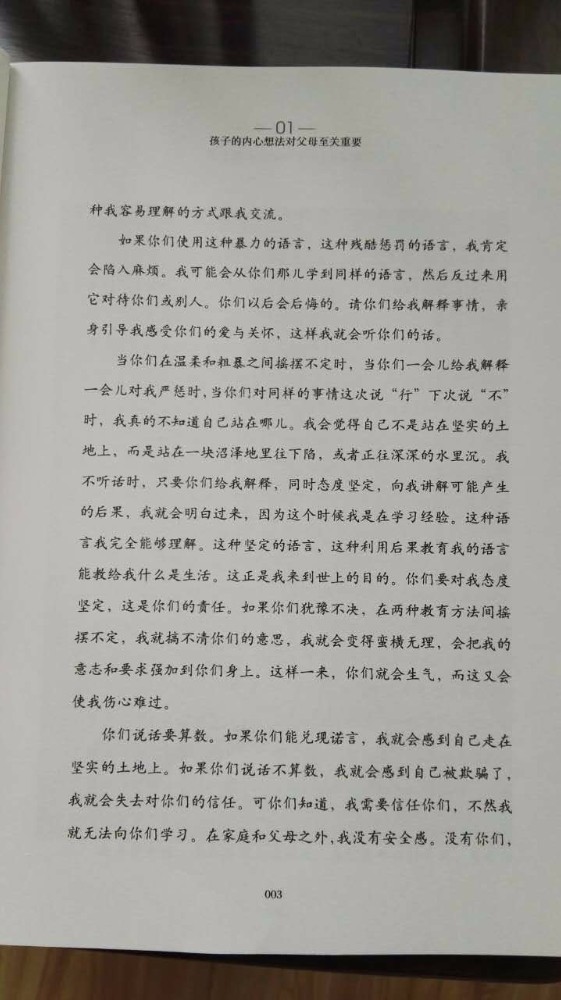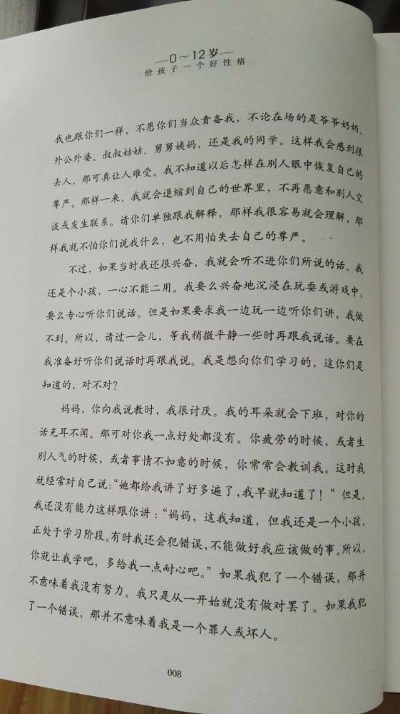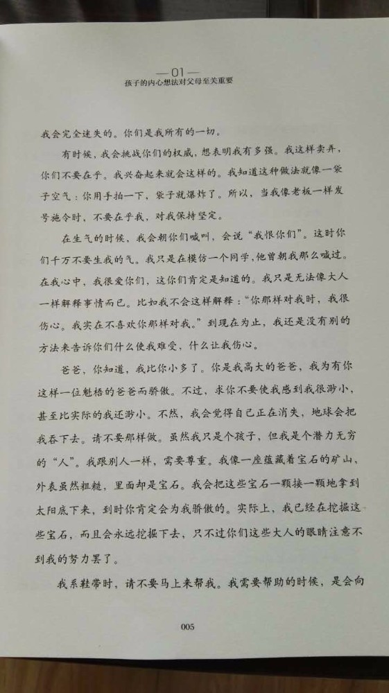 读到这些独白的时候,我感觉自己的心一点点的往下沉,如果孩子的内心世界真的如此,那么,作为父母,我们曾经多少次的,多么粗暴的对待孩子?!是的,打从他们呱呱坠地开始,我们就正式上岗成为父母,可对于这个岗位,我们一点也不称职,我们没有经过学习,没有受过培训,无需接受试用期的考核,在亲子关系中,毫无经验,又掌控着绝对的权威,可以任由自己的情绪和好恶去对待孩子!这让我感觉不寒而栗!在对待孩子的时候,我们伤害了他们多少,绑架了他们多少?!