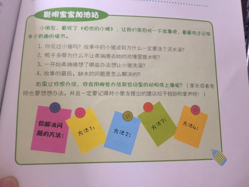 ![]() 首先非常感谢地带和心喜阅图书给予的这次试读的机会! 在孩子们成长的过程中,肯定会遇到各种各样的问题,是应该让孩子们自己动脑筋想解决办法呢?还是家长大包大揽帮助孩子度过难关呢?答案显而易见。其实,即使是很小的孩子,在家长或老师的启发和引导下,也会运用一些策略和办法来解决问题。《和朋友们一起想办法》系列故事符合4~8岁儿童的心理特征和接受能力,通过生动有趣的农场故事,教会孩子用正面积极的态度面对困难,不怕挫折,善于思考问题,寻找解决的方法。这已经是第二辑了,记得第一辑的时候,我们就获得过一本试读,没想到这次这么幸运,又获得了一本《怕热的小猪》。下面我们就一起来看看这个有趣的故事吧! ![]() 惯例,最开始的一个问题:怎样才能让一头生病的猪好受些呢? 我们在最后揭晓答案! ![]() 天气非常炎热,农场的动物们又热又渴,可就在这个时候,弗瑞德发现停水了。珍妮赶紧打电话给自来水公司。小猪波莉的泥水坑已经干了,她急需洗个泥水澡,于是他们去找弗瑞德,希望他能想个好办法。弗瑞德先是去池塘边盛水,可是池塘里的水也不够了,他又去溪边盛水,可是水蒸发的比他倒的更快,那还有什么好办法呢?这时,他发现了水管,于是想到了用泵动式太阳能抽水机,可是,打开开关后,水管还是没有水出来,可能是管子堵住了。就在弗瑞德拿起管子看的时候,水突然出来了,大家被吓的到处乱跑。水管在乱动的过程中,缠到树上,像下雨一样了,没想到,大家这下都能痛快洗澡了。刚好,珍妮也过来告诉大家,自来水管已经修改好了,很快也就有水了,大家都开心的洗起澡来! ![]() 弗瑞德就是这样,在遇到问题时,总能想到各种办法,一个不行,就试另外一个,总有一个办法可以成功的解决问题。而农场里的动物们,也都跟弗瑞德一样,会考虑问题,会想办法。《和朋友们一起想办法》(第一辑)注重家庭、幼儿园和学校等外部力量的引导,让孩子由外而内实现启发式成长;《和朋友们一起想办法》(第二辑)注重帮助孩子获得自信、发现潜能,让孩子由内而外主动成长。两个系列互相补充,形成良性互动。 ![]() 每本书的后面,还有“父母必读——如何培养孩子主动解决问题的能力”,为家长提供切实可行的提升孩子解决问题能力的指南;而“聪明宝宝加油站”则是通过提问式的互动,让家长或者老师可以轻松地与孩子进行沟通,引导孩子用开放式的思维方式,参与解决问题的具体事例。 ![]() 开头的问题,大家猜到答案了吗?原来是让猪哼一哼! 本作品未经作者许可不得转载,转载请征求作者意见。擅自转载使用,将保留追究其法律责任的权利! 个性签名