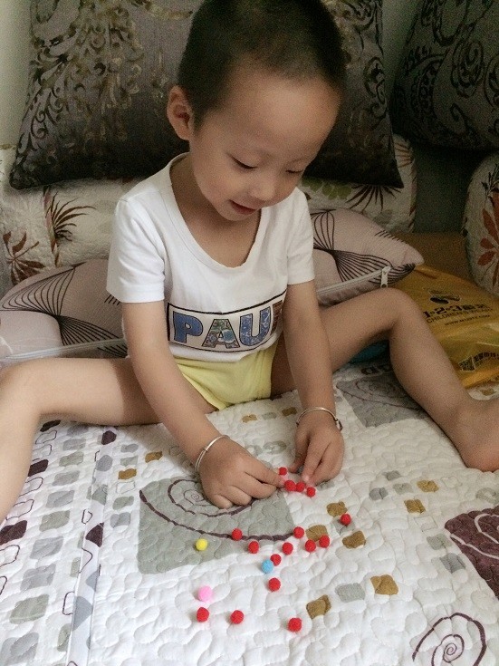宝贝在抽屉里翻东西,还从抽屉里的一个盒子里把一些做手工用的小毛球拿出来玩。有各种颜色,之前自己网购来的,平时偶尔可以用它做小手工,不过最近都没有动手做过了。一直是抽屉里囤着呢。这下宝贝把它们从抽屉里翻了出来玩。各种颜色的小毛球还是挺可爱的。 宝贝在沙发上数起了这些小毛球,还问我数的对不对。看宝贝蛮有兴趣的,于是干脆我们就来玩数数的游戏吧。我提问,宝贝来作答。如果答对了,我就说:“哇,好棒,恭喜你答对了。”同时作为奖励,每答对一题就奖励一粒葡萄。宝贝很期待,于是游戏马上开始啦。我抓了几个,叫宝贝把总数给数出来,一开始的时候比较简单一些,都是10以下的,后来是20以下,然后是30以下。宝贝对10以下的数数基本上没有问题,20的也可以。宝贝赢得了好些的葡萄,一边吃着,一边我说着“恭喜你答对了”……但是数到20几的时候就开始出错了。因为随着数的增多,宝贝一边嘴里数着,一般手指着小毛球,动作和嘴里说的不统一,于是就出错啦,有时候多数了,有时候又少数了。纠正后,我们一起练习多数了几遍。