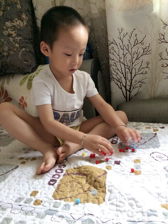 接着我们又换了另外的方式,把各种颜色的都参和进来。比如:2粒蓝色的+7粒红色的=多少呢?宝贝也开始琢磨,把我说的颜色的小毛球挑出来后,然后放在一起数总数。没想到简单的大部分都答对了。不过也只限于10以内的加法,可一多起来就出错了。所以还是要慢慢来,只要宝贝感兴趣,每天都可以适当的来学习和练习一下。今天我们玩的基本上就是数总数,还有简单的加法,宝贝都是挺有兴致的,等改天可以再玩一玩简单减法的游戏。在这样的游戏用可以让孩子去思考,再借助小毛球,一些简单的数数和十以内的加法也得到了一定的锻炼。感觉还是挺不错的方式吧。
