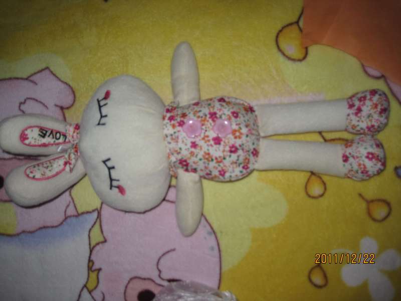 整只兔子被揪成一团,看起来就是很不美观,质量很差的那种,我一直怀疑和网上写的不一样呢,网上:规格:40cm / 0.5kg ,40cm应该不小啊,可是这兔子怎么看就是小小的估计就20啊,。还好打开,兔子伸长身体,整体还可以,看起来是还算可以,但是整体估计还是没20,要连耳朵才有40,整只兔子算小小的吧 ![]() ![]() 话说材质,又是失望,一直认为是那种珍珠棉的,再去看看说明,原来是我看错了,产品介绍“采用高质量南韩绒面料,毛质手感非常舒服,PP棉填充剪裁做工精细”,看起来是还可以,摸起来就是感觉没那么高档吧 还好,晚上一拿给萌,萌还是很高兴的,一个晚上就要和兔子玩,最近又经常看兔子汤姆系列的书,所以萌就更喜欢兔子了,一个晚上抱不停的 ![]() 家