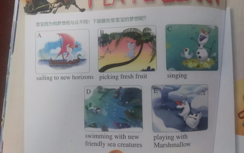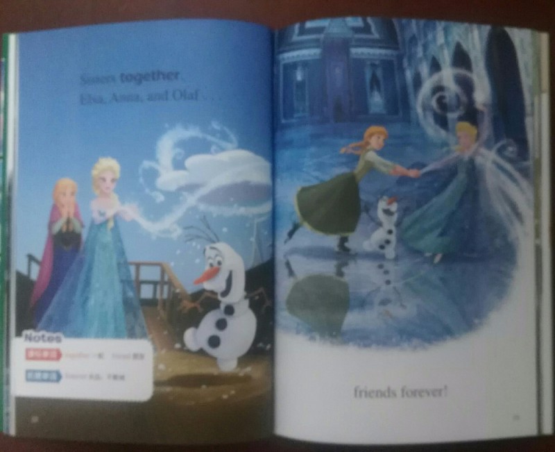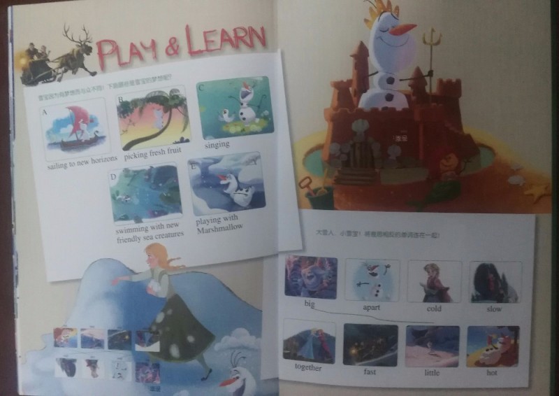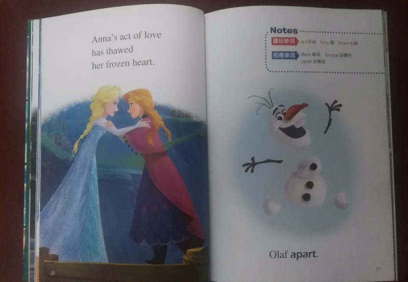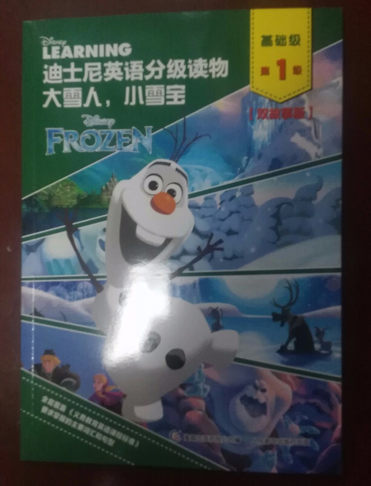 幸运的在@宝宝地带读到了这本由@童趣出版社编著,@人民邮电出版社出版的《迪士尼英语分级读物 基础级 第1级》,拿到书后孩子爱不释手。欣喜若狂。这套书是由迪士尼专家团队结合中国孩子的英语学习特点,推出的适合中国孩子的分级英语读物,基础级别这套书是结合6-9岁孩子喜欢和熟悉的动画故事来学习英语的书。我拿到的是与《冰雪奇缘》相结合的《大雪人,小雪宝——Big Snowman,Little Olaf》。冰雪奇缘孩子们都很熟悉,也很喜欢,曾经迷恋了很长一段时间,爱莎公主美丽、善良,孩子曾当了一段时间小迷妹,还买了相关衣服