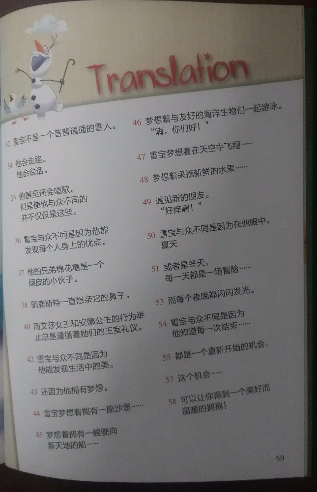 ,这也是本书的一个特点,结合流行的动画学习英语。![]() 这本书设计贴心:每页Notes中标注出课标单词、拓展单词,以及常用结构。迪士尼的家中有好几本,书中插图颜色鲜艳,色彩性强,更容易吸引孩子阅读。每本书都很有意义,冰雪奇缘,孩子本来就喜欢,再加上这么漂亮的插图就更容易喜欢看了。上图来感受一下色彩。 ![]() ![]() ![]() 本书是配有音频的英文绘本,让孩子学习纯正的英语,解决了家长们的后顾之忧,比如我:英语发音就不准,在孩子面前有时候就没面子,孩子有时候会问我:麻麻,你以前学过这个单词么?这本书不用担心音标,从而给孩子进行有效输入,刚开始就要输入正确的东西。音频还可以反复听讲,英语磨耳朵,达到精准学习。孩子们跟我原来接触的环境不一样,学习的东西也不一样,有的单词我都不会读。这本书避免了这样的尴尬。 还有课标词,也能让家长更清楚的了解孩子学校的英语学习能力,知己知彼百战不殆,在学习中有的放矢,使家庭英语阅读与学校英语教育形成合力。 ![]() ![]() 故事后还有中文译文,附有译文可以使孩子与家长都能翻译,并且正确的翻译,到达学习的目的。避免学习的尴尬。更容易掌握学习程度。 书后附有“单词表”,按字母排序,方便查找。 ![]() 本书为了增加情趣性,也为了吸引孩子,调动孩子的积极性,本书还有互动环节,有孩子们比较喜欢的看图回答问题,有了情景,带插图,更好的提示孩子,孩子们也更爱读。还有连线题,这种题型孩子比较喜欢,本书寓教于乐,连线是反义词连线,快乐中学习了英语,可以更形象的掌握反义词,我觉得这里创作团队也很用心。 ![]() ![]() 这本书是一套分级阅读书,分级阅读可以根据孩子自身的特点,依孩子的学习进度,有的放矢的选择读本,这样就更有目的性。目前各级别的书已经陆续上市,以飨读者,孩子们生活在万紫千红、百花齐放,百家争鸣的时代,能更好的学读到不同层面的知识,更好的满足自己的需求。若您还想温故知新,还可以和孩子们一起看场英语电影。《冰雪奇缘》,因为孩子喜欢,我们是在电影院也看过,在家中也看过,中文、英文版的都有,英语歌,let go,let go,在她嘴里也流行了一段时间。 这本书故事并不能连贯在一起,因为主要是为了英语学习。书的目的就是应用熟悉的故事帮助孩子们学习,提高孩子的兴趣,认知语境。大版本,字体清晰,插图好看,设计周全,是爸爸妈妈、孩子学习的好帮手。总之这是一本学与玩相结合的英语学习书,希望大家喜欢。 本作品未经作者许可不得转载,转载请征求作者意见。擅自转载使用,将保留追究其法律责任的权利! 个性签名