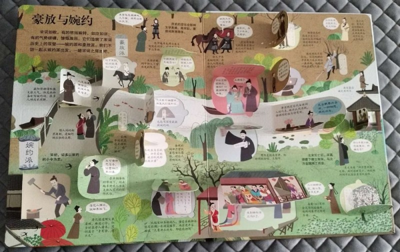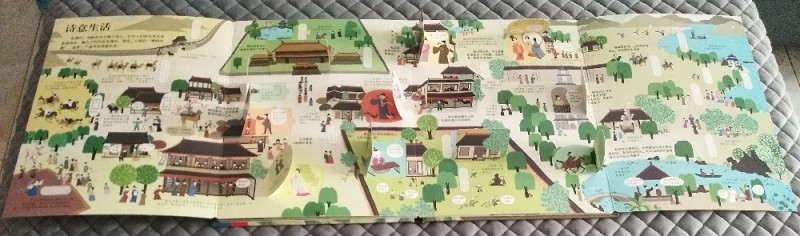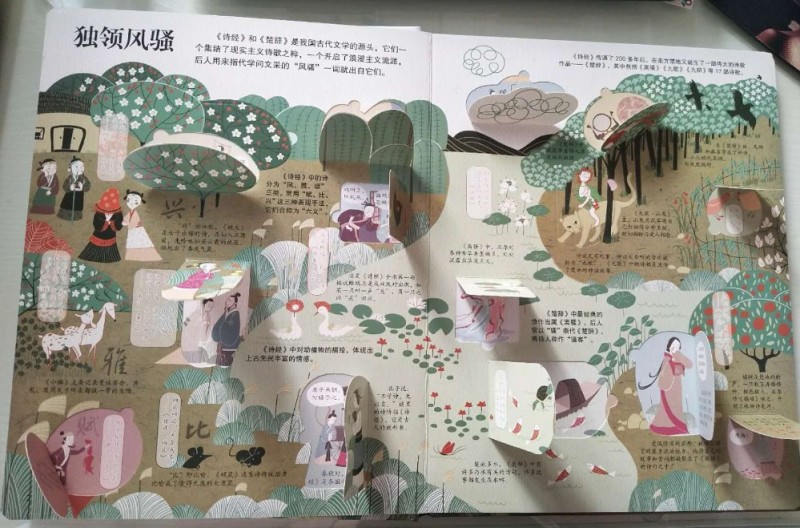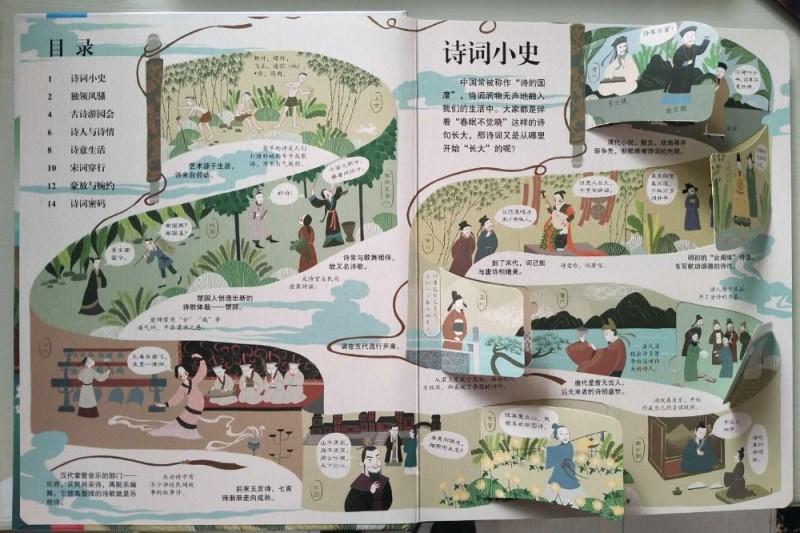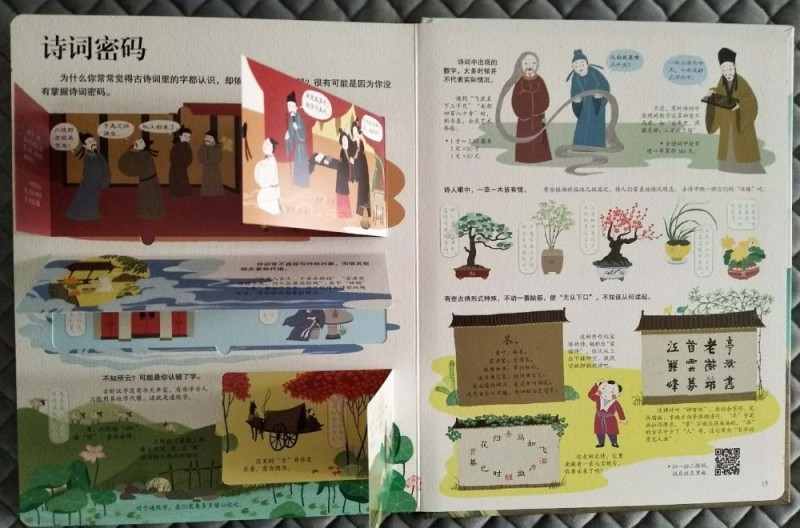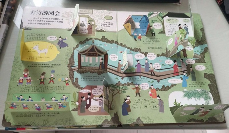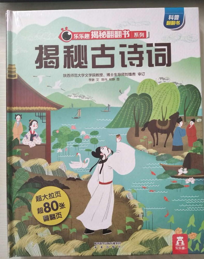 ![]() 精美的装帧,精致的印刷排版,各种精巧的翻翻页设计,这本《揭秘古诗词》一如期待的精彩!封面设计也非常用心,非常吸引人,看着封面就能感受到浓浓的古诗词气息。 仔细观察,不难发现很多著名的古诗词场景都在封面中了,看到这些场景会让人不由然想起那些著名的古诗词来。“举杯邀明月,对影成三人。。。。。。”,看到封面C位仰天举着酒杯的李白,不由然就从心底冒出了这句诗来。 说到古诗词,每个小朋友都会背上几首。甚至有的孩子出生接触的第一本书就是唐诗宋词。进入小学后,背诵、书写古诗词更是孩子们必须完成的学习内容和作业。很多外国人热衷来中国留学学汉语,也是被中国的古诗词所深深吸引。而诗词之所以能经久不衰,至今读之仍感觉满口生香,字字珠玑,可见中国古诗词的魅力。 小时候看到很多引用古诗词的文章,就感觉特别文采;看到那些引经据典,出口成章的也感觉特别佩服。现在看来其实都是读古诗词的好处啊,哈哈。优美的诗词,真的是越品读越有意境。“腹有诗书气自华”,常读好诗好词,就连人的气质都会很不一样呢!我给孩子买的第一本书也是《唐诗三百首》。所以,这本《揭秘古诗词》的到来,让我感觉如获至宝。 这本书加上首尾封面内页才一共8页外加一个大拉页,但是内容非常丰富。排版非常清晰明了,一页或者一个对开页讲述一个主题。 ![]() 全书一共八个主题,8页内容,虽然页面很少,但是内容都隐藏在翻翻页里面,短短八页的内容,一共精心设计了超过80张翻翻页。各种形状,各种方向的翻翻页就像艺术品和玩具一样,让孩子在动手翻翻中感受到完全不一样的阅读体验。 ![]() 再来看看图书的插画,每个对开页呈180度展开,每个对开页是一个大全景。每一个翻翻页里外的图片场景都非常小,但是这丝毫不影响图画的质量。多重图文注解,每一页的内容都非常丰富而易懂。 ![]() ![]() 更赞的是书中还特别设计了一个超大拉拉页,既增加了孩子阅读的乐趣,又让我们在超大全景图中深切感受到古人丰富而惬意的诗意生活。 ![]() 中国被称为‘诗的国度’。最早的诗是人们打猎时喊的号子或歌谣。那时候的诗词就像现在的歌词一样,都是配乐编舞,要唱出来的。诗常与歌舞相伴,所以叫诗歌。汉代时的很多乐府诗都是从民间采集的叙事诗。可见诗词跟古人的生活息息相关。 说到古诗词,人们只知唐诗宋词,其实《诗经》和《楚辞》才是我国古代文学的源头。一个集结了现实主义诗歌之萃,一个开启了浪漫主义流派。《诗经》是古人最早的教科书,过了200多年后,《楚辞》问世,开启诗歌新纪元。而到了唐代,迎来了诗歌的盛世,一代代杰出的诗人创作出一篇篇不朽的诗作。 唐代的诗歌融入到了时代的血液,融入到了人们的生活中。甚至在举行婚礼的过程中,催新娘化妆、下阁楼、拜堂都要吟诵诗歌。宫廷的教坊负责将诗歌谱曲编舞后演出,文人们以诗作被教坊采用为荣。诗人之间常常将诗当作礼物互相赠送。而喝酒、品茶都能激发文人们作诗的雅兴,各种酒肆、茶馆都成为诗歌的诞生地。文人们还喜欢把诗写在公共场所的诗壁、诗板上,因此诗歌得以广为传颂。 只是吟诗作对还不够尽兴,古人发明了很多诗歌游戏。比如飞花令、九宫格、对对联等等,怪不得那么多人想要穿越回唐朝,在书上看看那个时代人们的生活就好羡慕啊,真是充满了诗情画意。 ![]() 凡是很快就能传唱起来的诗歌都是文字优美,意境深远。直到今日,每次细细品读那些经典的古诗,一言一句都是那么完美,词与词之间的搭配,上下句之间的衔接都是那么的和谐优美,读之口齿留香。之所以如此,是因为古诗尤其是近体诗特别讲究对仗和押韵,专注韵律感,另外古诗中有很多修辞手法,让古诗更加韵味十足。 所以读古诗一定要读出抑扬顿挫和腔调来才有感觉。受社会政治经济影响,和个人经历原因,不同时代的诗人创作出不同流派的诗歌。“长风破浪会有时,直挂云帆济沧海”,李白的诗最能代表盛唐气象,积极昂扬,自由豪迈。“朱门酒肉臭,路有冻死骨”,杜甫亲历唐王朝由盛而衰,最能体会黎民疾苦。 词兴起于唐代,在五代开始流行,到宋朝达到鼎盛,与唐诗相媲美。词由大小不一的句子组成,跟诗比有独特的形式美。宋词一般先有曲调,再由文士们填词。同一首曲子,可以填不同的词。曲名叫作词牌,每个词牌的旋律、格式都不一样。 ![]() “大江东去,浪淘尽,千古风流人物。”;“花自飘零水自流,一种相思,两处闲愁。”;无论是豪放派还是婉约派,无论是现实主义还是浪漫主义,词的表现形式都比诗要自由潇洒很多,不过虽然不再像近体诗有那么多的条条框框,讲究对仗和押韵,但是也是讲究韵律的,所以读起来才会那么优美爽口。 不过,虽然大多数诗词文字都很简单,但是我们读起来还是经常会一知半解。原来是因为诗词中暗藏了很多密码。比如,诗词经常不直接写吟咏对象,而是借其他事物代指,还有就是通假字。比如“天苍苍野茫茫,风吹草低见牛羊。”中的见读‘xian’,通‘现’,意思是出现。 ![]() 还有,诗词中出现的数字大多不代表实际情况。比如“飞流直下三千尺”、“白发三千丈”,这些都是艺术夸张手法。 还有一些古诗形式比较特殊,比如‘宝塔诗’、回文诗、“神智体”等,想要读懂这些诗还真是要花一番功夫。不过也足见古人的智慧。 哇,看似