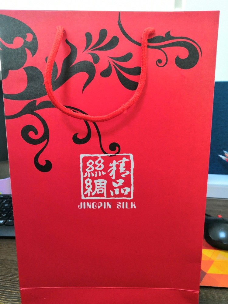 当时这条丝巾是用了一个拎包包装着的,说实话,这个手拎包反而更加的吸引我呢,觉得是很好看的,大红色,配上上面的图片,很有复古的感觉,上面有4个字——丝绸精品。对于丝绸我是不了解的,看着不知道到底好不好,就是这个装丝绸的小包真的是觉得好看啊,女儿也是觉得好看,到奶奶面前后,把丝巾拿出来了,包留着,哈哈,真不愧是女儿,这想法都给我一样的啊。