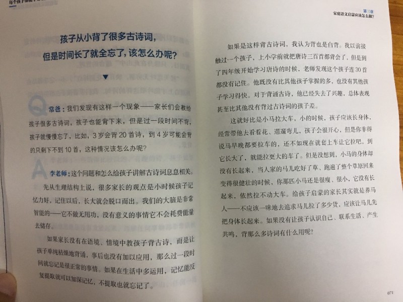 ![]() 幼小衔接有没有必要上?什么时候教孩子认字、写字好?……这些都是当下让我们做父母感到困扰的问题。以前孩子小,也就是吃喝拉撒睡的事,都觉得好累。到现在孩子大了,才发现现在才是真累,因为要替孩子想的事情太多了。“父母之爱子,则为之计深远”,当父母的就得替孩子想,还得想得远。而小学又是培养好的行为习惯的关键时期,如何培养孩子的学习力是特别重要的。《常青藤爸爸对话特级教师书系》(2册),是百万粉丝公众号创始人常青藤爸爸深度对话有用20年一线经验的语文、数学特级教师,揭开让孩子学好语文、数学的奥秘。从学龄前、幼小衔接到小学阶段,给我们提供清晰的语文、数学启蒙线路图。 ![]() 老话说“学好数理化,走遍天下都不怕”,然而如今的说法却是“得语文者得天下”。随着语文的不断改革,语文已经由过去的接近标准化的几乎是唯一答案的考试模式转变成深度阅读了。培养孩子的阅读力和理解力是非常重要的。但又从而培养起呢?常爸说他的阅读习惯基本是从小学时期培养起来的。虽然家里经济条件一般,但他父母订阅的报刊、杂志很多,每周老师布置的作文,他的妈妈都会很用心地审阅,写得不好就改到妈妈满意为止,甚至有时候要推翻重写。到小学高年级之后他的父母几乎没管过他的学业,可他成绩一直名列前茅,后来还出国留学。这都得益于父母早期对他的“投入”,提供充分的阅读条件,低年级给与足够的关注,培养好的学习习惯。所以说,小学阶段真的是非常重要的。 ![]() ![]() 虽然我们也经历过小学,但现在的小学跟我们那会完全不一样。我看过侄女的一年级作业,总的一个感觉就是这也太难了吧?且不说别的,就连读懂题目都有难度,如果没有上过幼小衔接,我感觉还是挺吃力的。但幼小衔接真的有必要上吗?很多人认为有必要,也有很多人认为没必要,双方给出的理由我感觉都有道理,所以感觉也是挺迷茫的。在本书中,常青藤爸爸对话李怀源老师,提到幼小衔接是否有必要,因人而异,但其核心是听说能力。就好比是小马要先把身体养好,而不是急着让他拉车。至于如何培养,李老师也给出了具体方法,我认为是非常有帮助的。 ![]() ![]() 以前我也很纠结到底要不要教孩子认字,我知道写字是不宜过早的,因为孩子的手指、手腕还在发育中。而认字这方面,看到现在的一年级难度就这么大,要求识字量还不小,我就挺犹豫的。在看了这本《每个孩子都能学好语文》,我总算能够缓解一下内心的焦虑了。我们可以教孩子识字,但不是机械地让他们去记,而应该是在生活中自然习得,不必追求数量。只有内化,才能够保持长久的记忆。这本书很全面的讲解了什么阶段应该教给孩子什么,如果家里有学龄前孩子,真的很有必要备一套这样的书。 ![]() ![]()