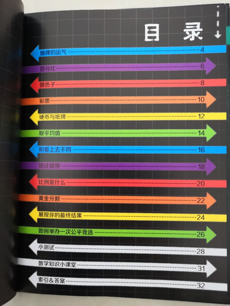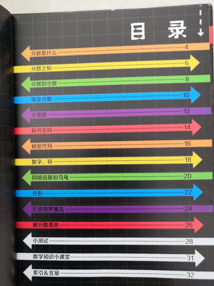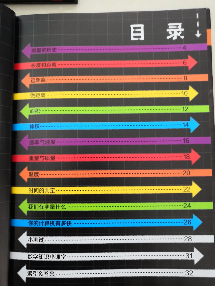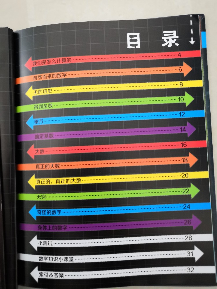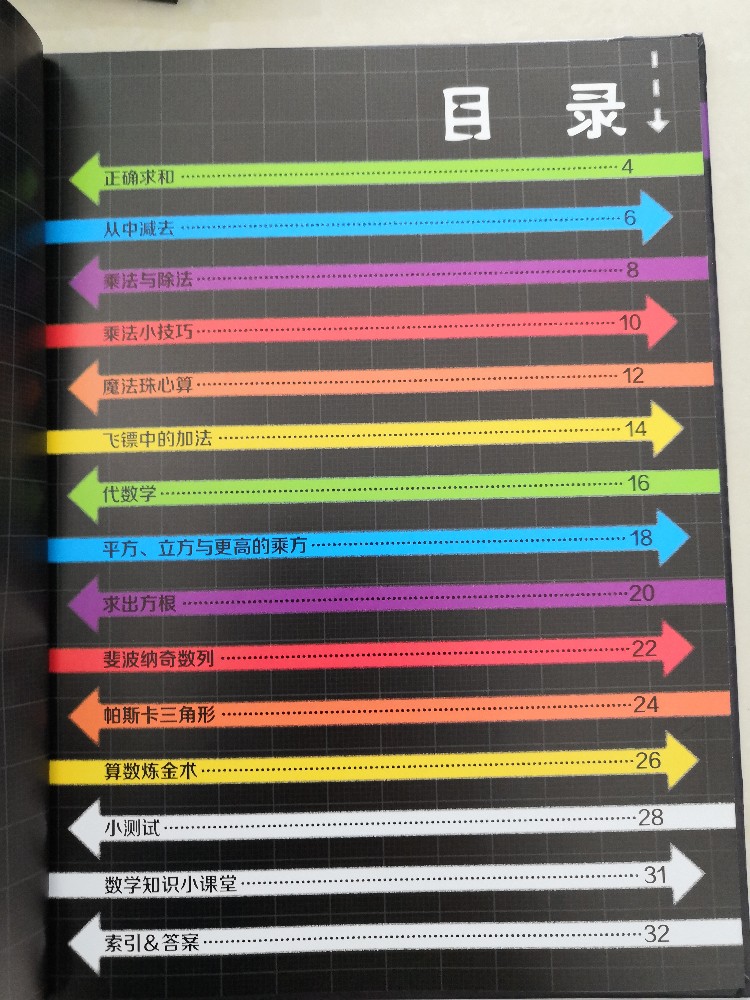 而且这套书的质量很好的,精装本的,绿色环保印刷的,色彩很鲜艳,文字清晰无异味,非常的让人满意,看着也是非常的舒服的,有种赏心悦目的感觉。每本翻开后,都是有目录的,而且都是箭头那种的色彩间隔开的,看着就是很喜欢,可以让孩子看看有哪些颜色,是按照什么顺序排列的,你看,就光一个目录,就暗含了数学知识,而每本都是有小测试、数学知识小课堂的,还有索引和答案,这点也是非常的贴心的,毕竟我们当家长的,很多也是不会的,这样可以相互对照一下,也省得交给孩子错误的知识。