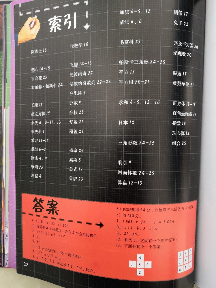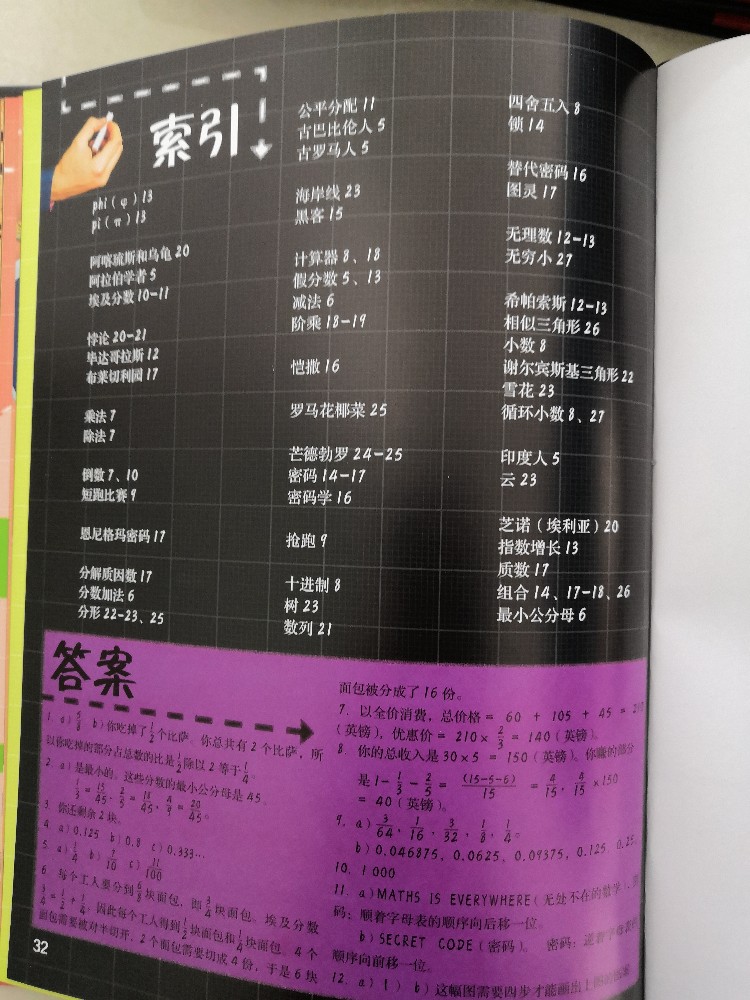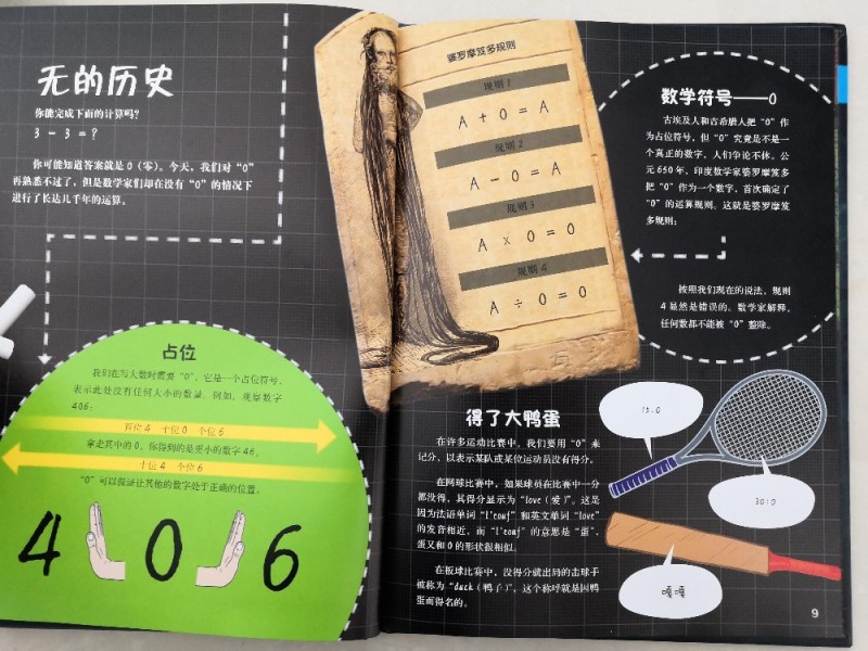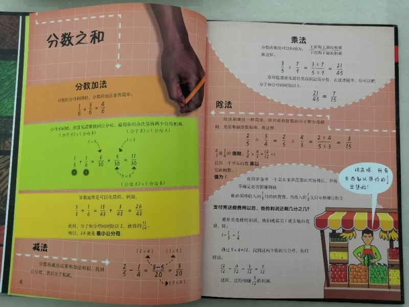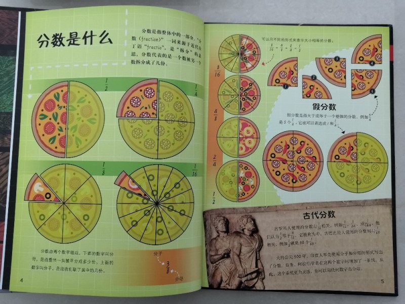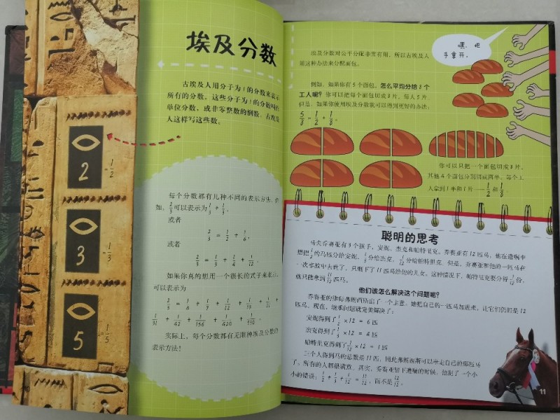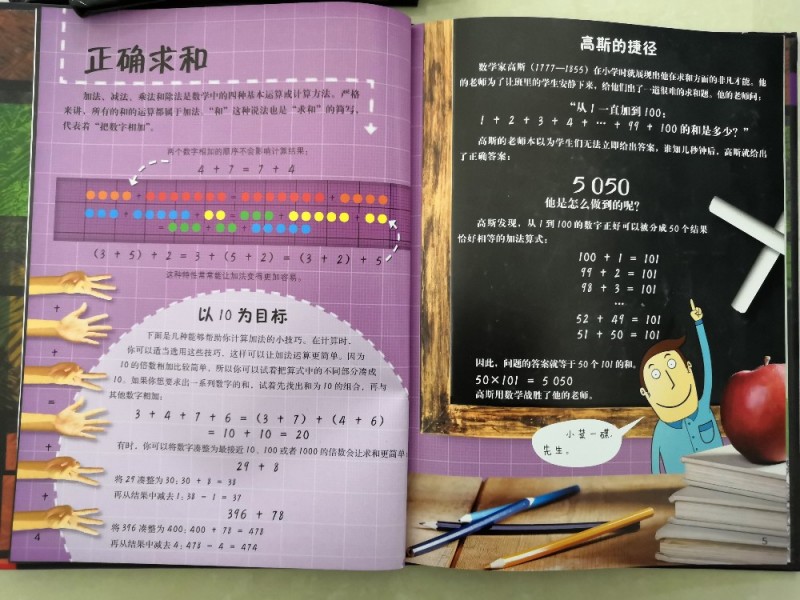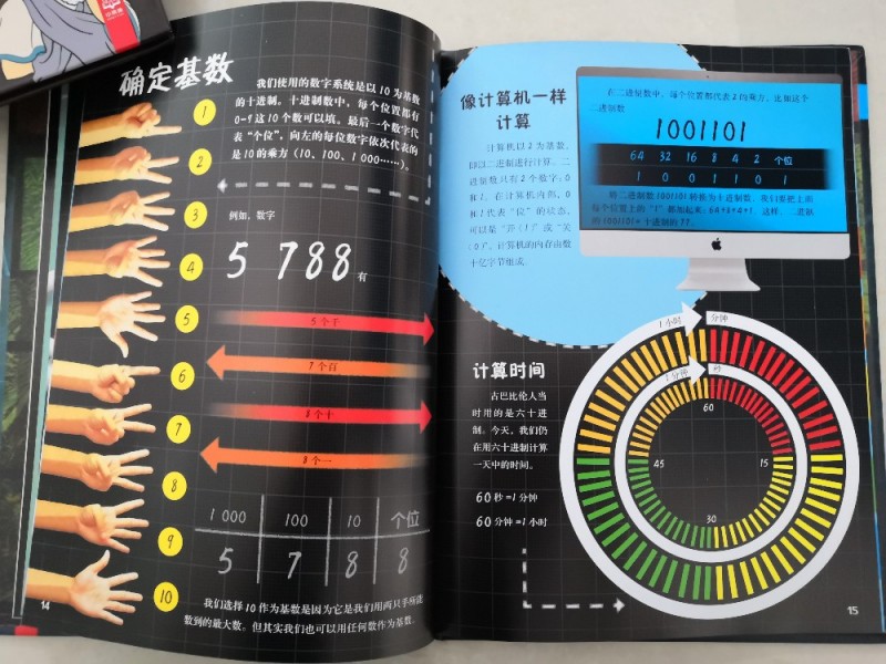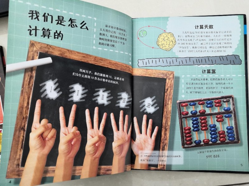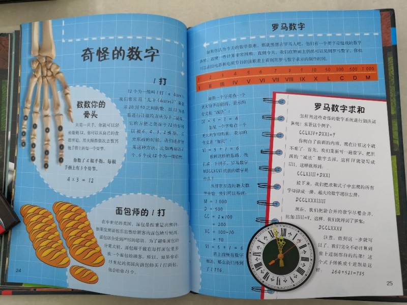 儿子总说手指头不够用,而书中居然介绍了用手指上的骨节来数数,真的是觉得太聪明了,这样除了大拇指,就可以很轻松的数到12了,这也是一打的由来,长知识了。还有罗马数字求和,知识点太多,这得孩子慢慢的去吸收,从而学会运用。