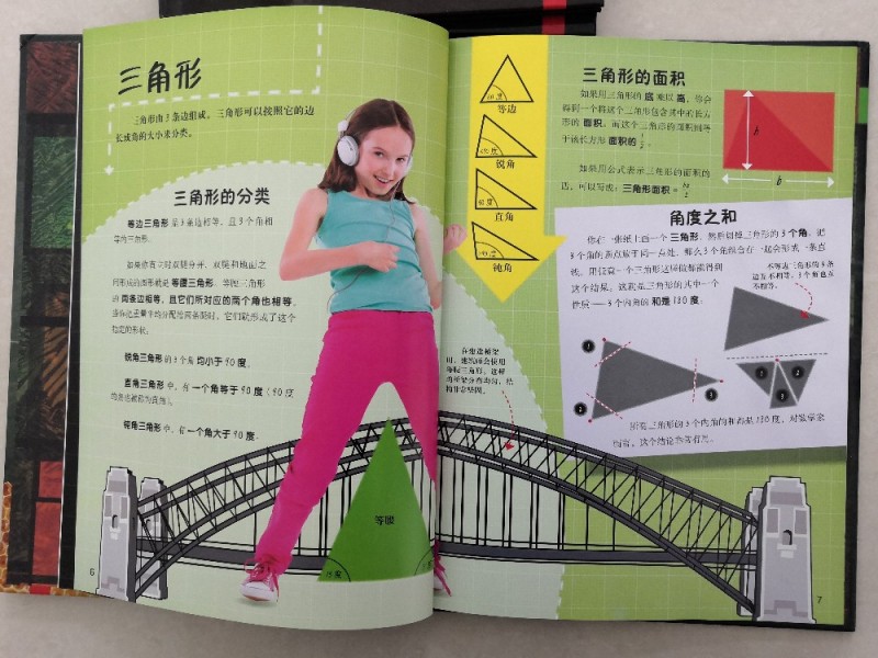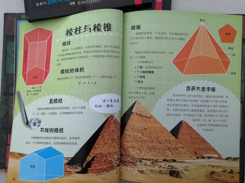 《走进形状的世界》,简单的圆形、三角形这些儿子认识,女儿大多数也认识,遇上柱体、椎体、多边形等等的,孩子就是会觉得蒙圈,女儿是压根就不认识了,书中就有提到金字塔,这个算是比较典型的代表了。三角形也是不同的,有等边三角形、锐角三角形、直角三角形、钝角三角形,这些儿子还不知道,书中也是有介绍的,而且还以一个女孩子的站姿,来很好的诠释了等腰三角形,这是非常的形象的,也有种恍然大悟的感觉,真的是太喜欢这套书啦。