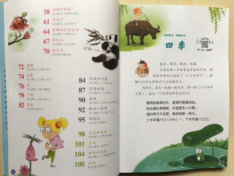 ![]() 看到群分享《百变马丁大语文新阅读·小学一年级下册》,我第一反应就是想到侄女刚好是一年级下册。每次放假回去也有帮忙辅导一下她的作业,对她的学习还是有一点了解的,觉得这本书非常适合她,所以很积极地参加了分享,也很幸运地得到了试读的机会。收到书真的是非常的激动!第一次看到马丁是在动画片上,对于这个百变的角色,孩子都是非常喜欢的。那么由百变马丁来展示各种语文形式又将是如何的呢?就让我们一起来看一看吧。 ![]() 《百变马丁大语文新阅读·小学一年级下册》是由全国语文特级教师及一线教师精心编选,跟统编小学语文一年级下册教材同步,内容涵盖课文上所有课文及语文园地篇目。一看就是特别专业,而且针对性强,首先要点给个赞。主编的两位作者,其中一位李建荣是小学语文特级教师,国家级骨干教师,成都市首批名师工作室领衔人,硕果累累。另一位作者吴懿纯是北京市大兴区语文骨干教师,参与多部“全课程”教育改革实验读本的编写、多项北京市传统文化语文课题研究,在多项教育教学技能评优比赛中荣获先进个人一等奖。果真是专业性很强,能得到名师主编的书真是倍感荣幸! ![]() 翻开书本的目录,让人感觉非常的舒服。每一课都有对应的课文及语文园地,一看思路就很清晰。看到第一篇是对应课文《春夏秋冬》的《四季》,是由马丁来讲科普,讲到了四季的特点,还有现在的常考点:二十四节气。我记得我们小学那会是没有考过24节气的,如果要我来给孩子辅导,还真得先自己提前学习一下。我个人感觉要记二十四节气是有点难的,而这里的《二十四节气歌》明显是要容易背诵得多!扫一扫就可以听音频,很是方便,也很好记。睡前听一听,或是起床刷牙听一听也是有很好的效果的,这点真的是非常棒! ![]() 接下来是“马丁读美文”,对应《春夏秋冬》的是《济南的秋天(节选)》。这节选的片段虽然段,但却写出了济南秋天的美。美文之后,让孩子读一读描写春夏秋冬的词语,说一说哪些是描写秋天的,这个板块是“写作素材箱”,是为孩子的写作积累好词,扎实基础。之后是孩子最喜欢的“马丁讲故事”,以对话的形式进行,就好像是面对面交流一样。这个环节也是非常棒的,让孩子觉得亲近,理解上就更容易了。 ![]() 每一篇课文都基本是有这几大板块,并不一定都是一样的,是根据内容来调试的,个人感觉是非常棒的。以孩子喜欢的卡通形象来讲述,这样的学习方式其实要更好。主要还是内容针对性强,量身定做,这样能够很好地扎实孩子的语文基础。而内容也是多元化的,有古诗、儿歌、童话、寓言等等,提供百科式阅读素材。全书采用全彩设计,图文并茂,脉络清晰也是我喜欢的。还有很重要一点是附带二维码音频的,随时可以听。有时间就精听,没时间刷牙时、穿衣服时放来当作泛听也是可以的! ![]() ![]()