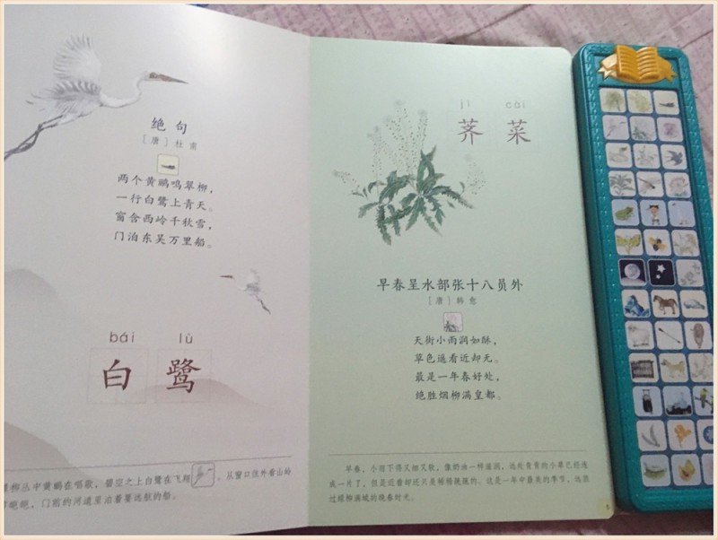 收到书本后相当的惊喜,这是一本6开超大的精装版儿童书,可以说是多媒体读物了,因为它与众不同,不是扫二维码来发声,而且直接在右边有一排的按扭,可以看中哪个图标,就按相应的按扭,接着就会有清脆的,有韵律的声音出来,那是一首首经典古诗,多听孩子们肯定就会记得了。封面十分的优雅,可以说是清幽,那手绘方式的花鸟虫鱼、飞禽走兽,看着特别的赏心悦目,我们一起来走进诗词的世界里吧。