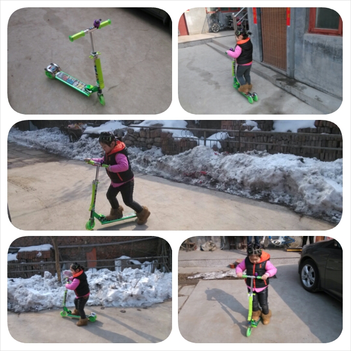 过年后,小家伙在姥姥家住了几天,爸爸妈妈问她,快过生日了,想要什么生日礼物。小家伙毫不客气地说出了她日思夜想的滑板车。于是,爸爸妈妈带着她去挑选了一辆她最中意的。那,就是这个了。