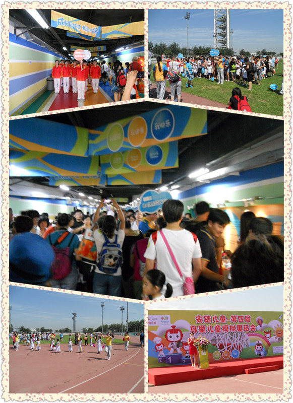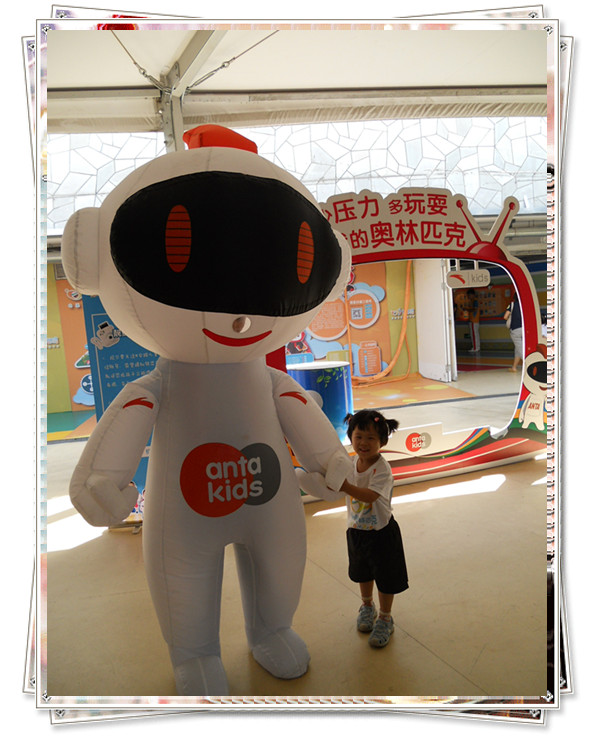 8月8日期待已久的儿童奥运会就要在鸟巢职业体验馆隆重举办了。 那天,我们早早便起床了,赶快吃过早饭后便出发了。九点多到了体验馆前,先找工作人员签到后领了宝宝的运动服,我正在给宝宝换运动服的时候有两个北京卫视的前来录像,因为给宝宝换衣服的时候宝宝是站着的,所以一直扶着我的头,我的头发当时估计是有些乱吧,于是这上镜的机会就交给了老公。老公在那里给宝宝整理衣服,宝宝到是也很配合。来一张宝宝耍宝的照片吧。