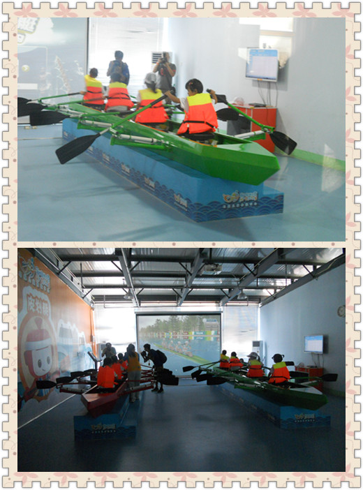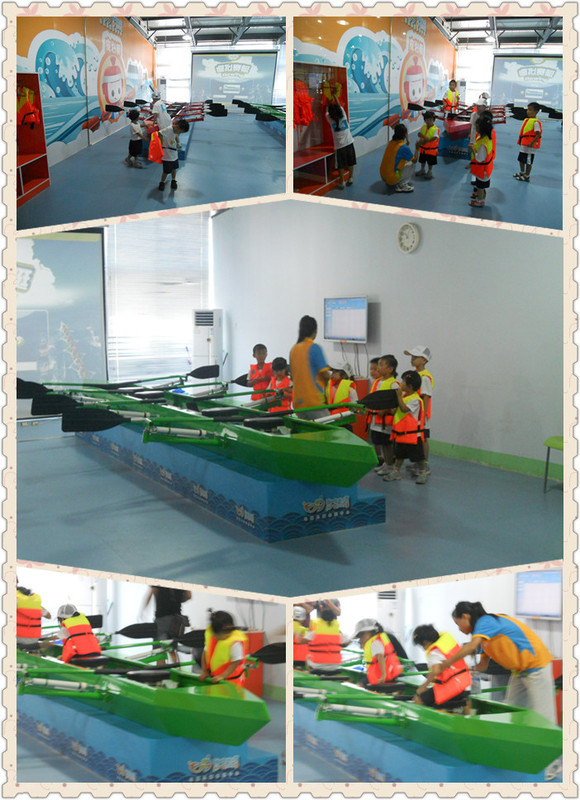 仪式结束后,正式进入比赛阶段。先到奖牌处与奖牌来个合影吧,当时想着即使得不上奖,有个照片留念也好呀。这个时候的奖牌是借的,来个合影就还给人家了。 宝宝先是进入皮划艇赛场,工作人员把八个孩子分成两组,演示如何操作,然后两组开始正式对决。看,还没穿衣服的宝宝已经按耐不住,跑到前面看看里面是什么样子的,因为这是宝宝第一次近距离的观看皮划艇吧。穿上衣服也不老实,左蹦右跳,而且还不时的耸动肩膀,这样那个衣服也会随着动的,宝宝感到很好玩吧。开始上皮划艇了,宝宝自己上了半天没有上去,还是工作人员协助了一下,看来宝宝有些小呀。