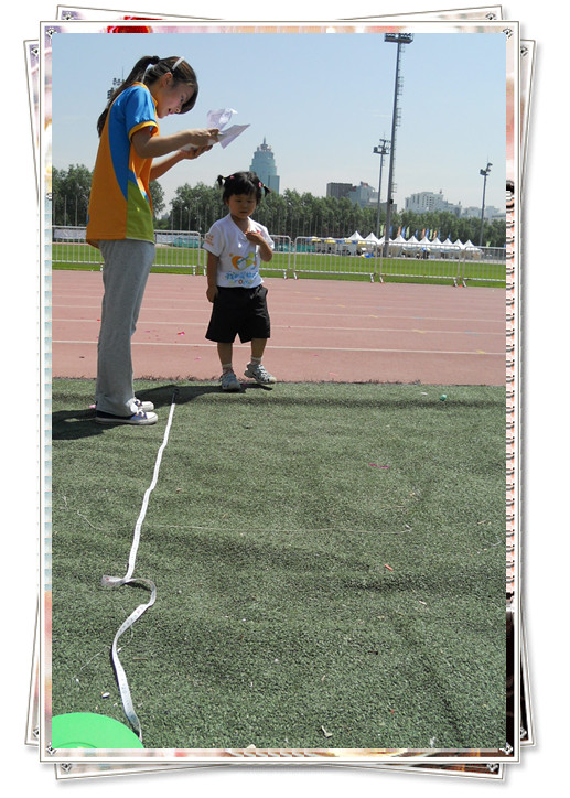 赶快赶往外场地,因为外场的比赛十二点前就结束了,而内场地的比赛到三点才结束的。这时已经十一点多了,还有两个项目没有比赛呢。 跳远比赛已经进入到了尾声,宝宝过去后基本上已经没什么人了,只有一个小姐姐在那里跳着。宝宝似乎对这个项目不太感兴趣,跳了一下,还非要拉着我的手。成绩当然不是很理想,让宝宝再跳两次,可是宝宝怎么也不肯。工作人员便把这次的成绩做为最终成绩了。