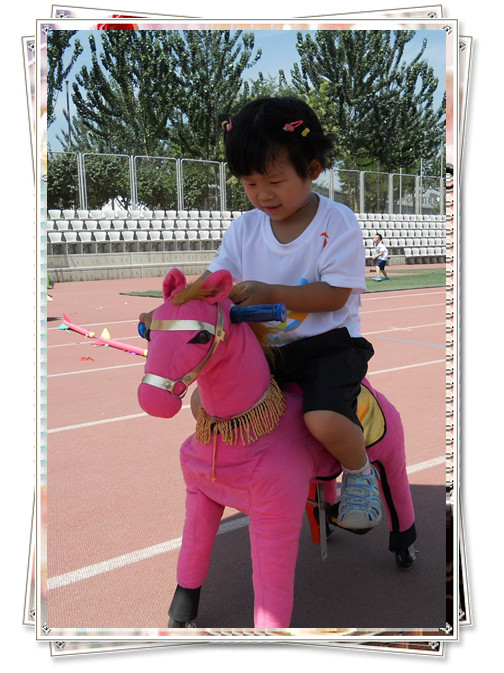 赛马比赛宝宝到是很喜欢,先试骑了一下,感觉不错哟。比赛正式开始了,宝宝的马总是偏离轨道,跑到其他的跑道了。不过,也顺利跑到了终点,因为是记时的,所以这个成绩究竟如何就不太清楚了。不过,宝宝玩得很高兴。