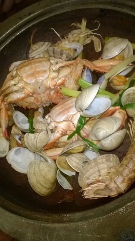 这家店应该新开没多久吧,店里人真心不多,估计可能是菜价有些高的原因。我们之前想去的店人太多,所以看这里人少就过来了。看了菜单之后终于知道这里人为什么不多了。上面照片中是我们点的两个餐前凉菜,芋头是沾着虾酱吃的,味道我有点吃不怪,不过老公喜欢。 ![]() 这里是道大菜啊,名字叫什么我是记不清了,就是一个类似于一个铁板是的平底锅,里面是各种海鲜,螃蟹、花蛤、白蛤、基围虾和皮皮虾几种,这么一个菜88元,老公是个海鲜控,这个菜也是老公提议点的,但另他很失望,螃蟹里没什么肉,可以说是空的,基围虾和皮皮虾到还好。不过我们说好,下次再来,一定不会点这个菜了。 ![]() 这个是我们点的最多的一道菜,干锅花菜,好像每家店都有,我也挺爱吃的,在我看来是很下饭的一道菜,这家店里卖30块钱,比别家店贵了一些,味道都差不多。 ![]() 这是一道粉条做的菜,名字我又忘了,但里面是有内容的,可不是只有粉条那么简单,汤中是有牡蛎的,所以这道粉条的价格一下子就上去了,好像也是三十几吧。不过味道还是很不错的,最后我为了把这些粉条都吃完,米饭都剩下了。除了这些之外,我们还点了个不素菜,挺家常的一道菜,我就没拍照片,不过味道还是不错的。