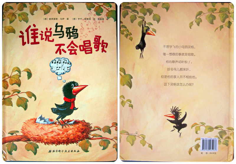 《谁说乌鸦不会唱歌》是在宝宝地带试读来的绘本,一直蛮受宝贝欢迎的,绘本里讲述了一只小乌鸦的故事。乌鸦夫妇有三个孩子,其中有一只很特别,很有个性的小乌鸦灵格,他不愿意飞翔,只想唱歌。可他开始不敢再父母家人面前唱,只能等父母和兄弟飞出了门,才敢试着放声歌唱。一次爸爸发现了很多鸟儿在家附近听灵格唱歌,乌鸦爸爸一百个不信,说乌鸦根本就不会唱歌,而回来的妈妈也不信,还告诉灵格不可以说谎,为了证实自己,灵格展翅高飞,寻找到一处更高更适合的地方,开始放声高歌!