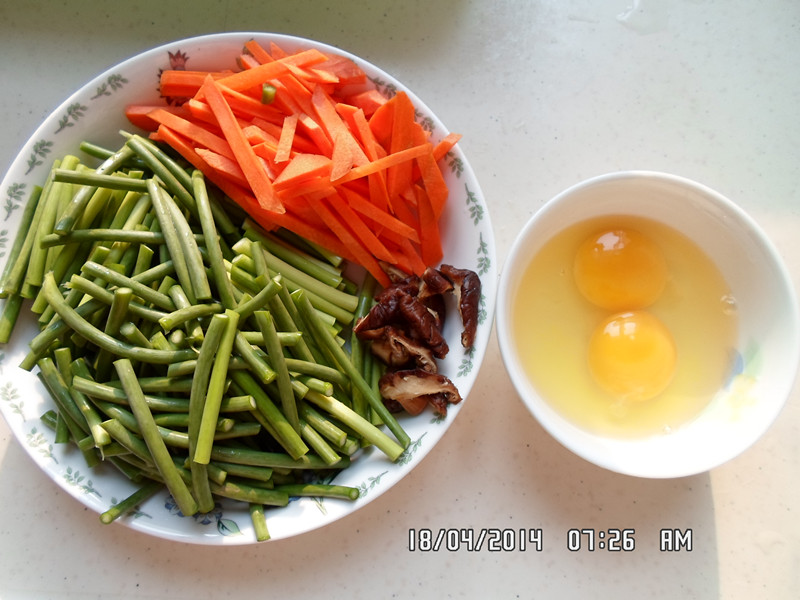 这些菜够我吃好几天呢,今天早上就把那些容易老的菜先炒着吃吧。就挑了那个蒜苔及莴笋菜叶哦。说实在的最近我比较少买蒜苔,觉得价格蛮贵的。这不也赶上吃个免费的蒜苔了,再不快点炒菜,莹爸就来不及吃饭了。原料如下所示:把蒜苔洗净,切成小段备用,胡萝卜切成条备用,还泡了三朵的香茹,洗净后切成小片。两个鸡蛋,还有少量的虾米皮。