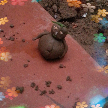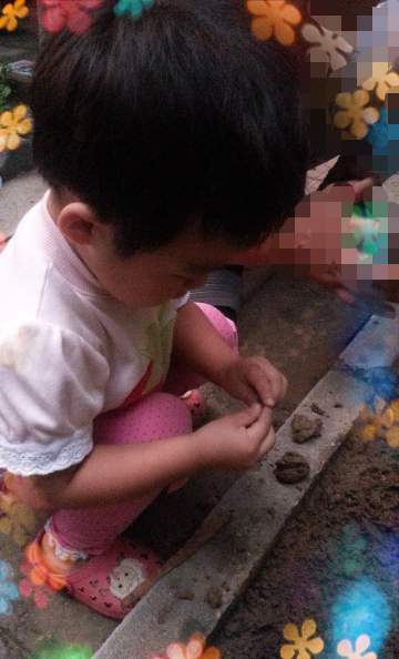 我们蹲在泥土边,我让一一玩泥土,一一虽然经常把手弄脏,但是没有玩过泥土。她看着我,我本来也不想下手的,可是一一也不下手。没办法,我就用手抓了些泥土搓成小圆球,对一一说“像妈妈这样玩吧”。一一也抓了一把泥土,但很快就扔了,伸出手给我看说“脏了”,我告诉她没事的,不玩的时候我们洗干净就好了。一一这才开始玩起来。