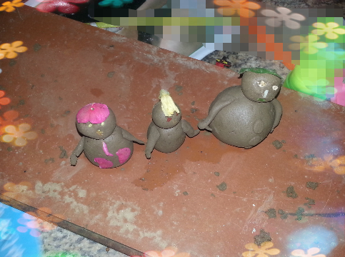 看看,这就是一一爸爸做的泥人,扣子可是一一搓的。刚开始只做了这一个,后来又做了一家三口,天气黑了,院子里看不见了,我就告诉一一,明天和小朋友一起玩泥人。