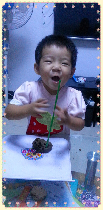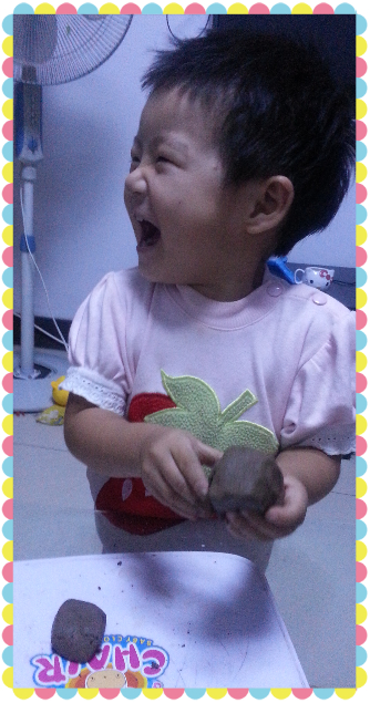 我们进屋后,一一把泥球拿回屋里了,很大一块土,她说是小汽车。然后用管子搓,告诉我“这是洞,你看,好多洞”呵呵,美的最后把管子放到嘴里,我赶紧给拿出来了。