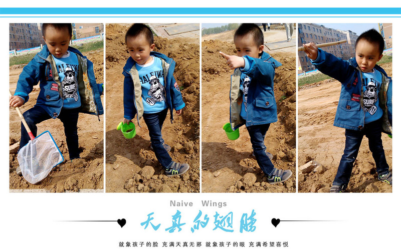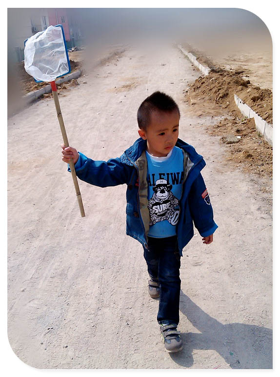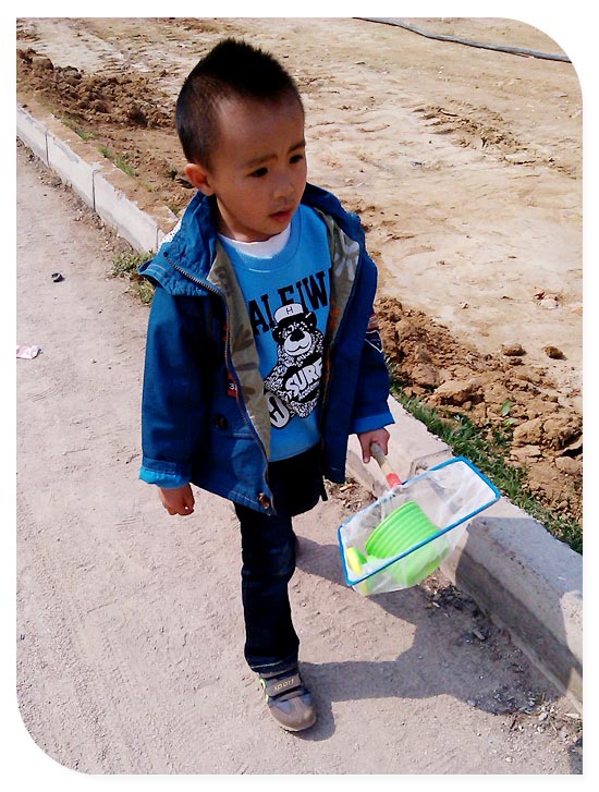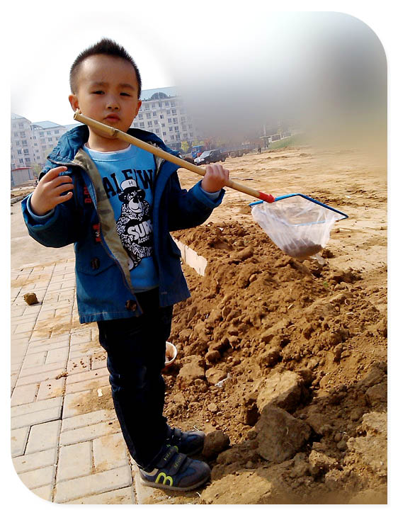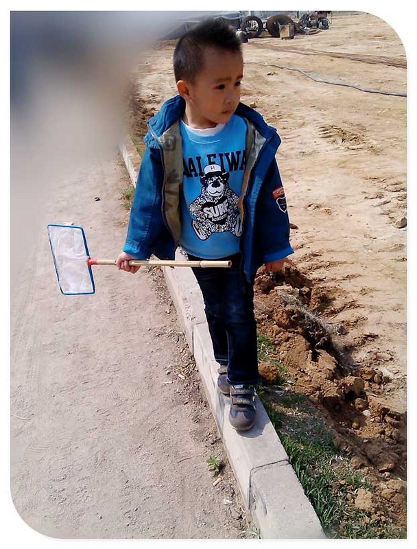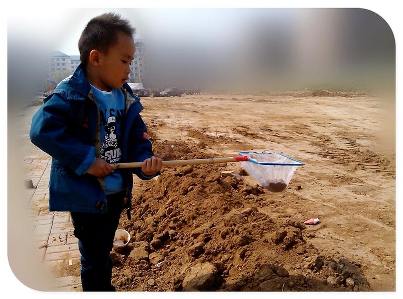 小家伙一时半会儿的也不肯动弹,后来干脆就拿起本来预备装鱼用的小罐来玩起土来,一边玩还时不时的看看车,真是玩、看两不耽误。因为当时手中还拿了一个捞鱼用的网呢,于是妈妈教谦谦如何筛土,通过这个网兜可以将细土过滤出来。最开始的时候是妈妈端着网,谦谦往里面装土,然后妈妈筛筛,看着细土流下来,谦谦说像是流沙一样的。后来小家伙自己筛土玩了,玩的带劲。总不能把时间都耽搁在这里啊,灰多土大的玩一会也就得了,妈妈跟谦谦商量说要去捞鱼啊,否则鱼到中午的时候就躲起来休息根本就捞不到了,小家伙这才移动脚步开始继续前进......