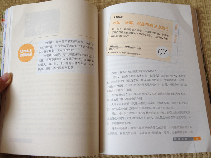 旅游一直是我的爱好,人或心总有一个在旅途!是我的座右铭!但沈佳慧老师的这本书告诉我,要带着孩子一起旅行!在我们看来不到一岁的孩子自己不会走路,带着她一起旅游绝对是个大累赘,还有一系列的奶粉、奶瓶、尿布、湿巾。旅途中找个换尿布的地或一瓶温度适宜的冲奶水都是麻烦事。但沈老师做到了,并且从她儿子八个月开始就开始了旅居生活直到现在。 书的撰写顺序不是以时间为序,而是把旅途故事分为:酝酿、出发、转弯三个板块。在酝酿的第一篇章,就提到了干嘛自找麻烦带孩子旅游,其实这也是我最关心的。作者提出:旅行是一种无形的熏陶和收获,带孩子亲身体验远比书本学习的多的多。书中并没有写她带儿子旅途的麻烦和艰辛更多的写的是儿子小k旅途中的收获和成长,这也使我对带女儿出游增加了信心。 书中的有一个故事我印象很深刻:爱丁堡动物园的“通缉犯”讲述了儿子小k年幼无知喂了企鹅树枝,妈妈一起带他向饲养员认识错误。其实因为年幼人人都会犯错,但最要的是家长面对孩子犯错的态度,如果一味包庇,孩子就会认可欺瞒和撒谎,或者认为天大的错误有父母顶着以后一二再再而三的犯错。作者发现儿子的错误后,没有包庇不了了之,也没有过度责骂,而是带着他一次去承认错误。陪着孩子正视自己的错误,一起补救才是以身作则的好父母。这也为我上了一课。 作者书中提到的欧洲的行车文明、语言文明,这次我的欧洲之行,我也感同身受。的确是这样,在改革开放突飞猛进的现代社会,上海的城市建设可以说是不输任何一个全球化城市,但人文素质却在流失。冷漠、急躁成了快速发展经济背后的人性问题。每天看新闻,总是接收各种负能量,如果能让孩子出去走走,看看外面的世界,对于她以后的选择和国际观的形成应该帮助很大。妞,妈妈说好了,以后旅行带上你,希望你的心胸宽广化、视野国家化。谢谢沈老师的书给我信心和鼓励也提供了很多前车之鉴。