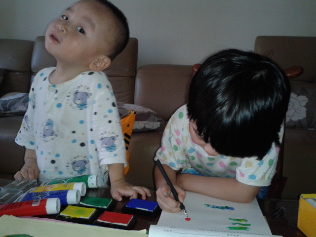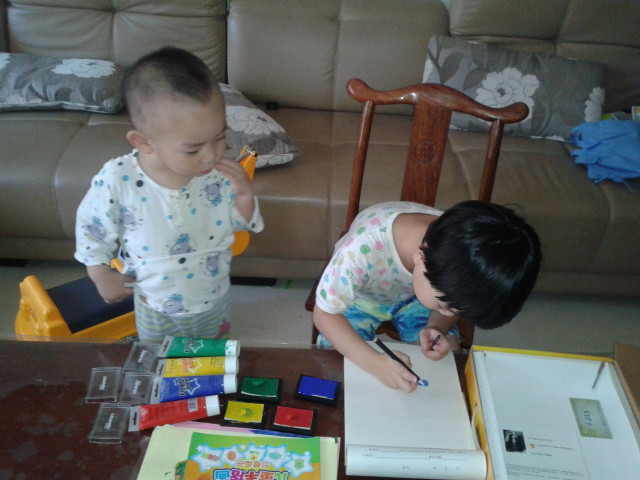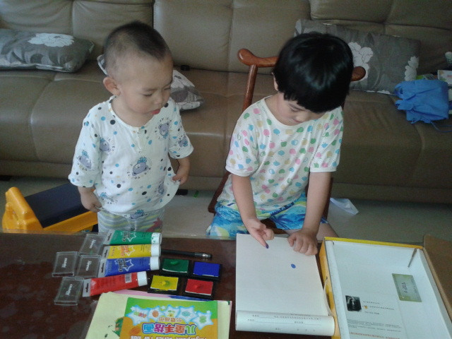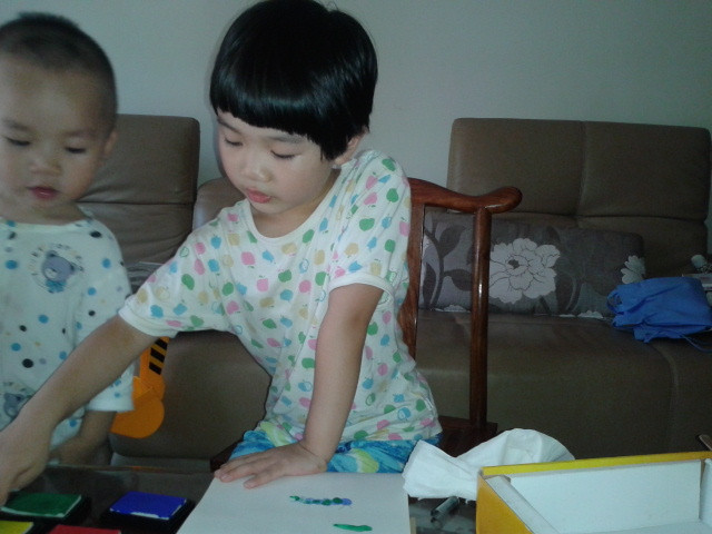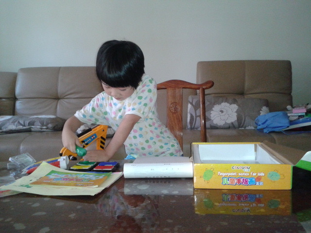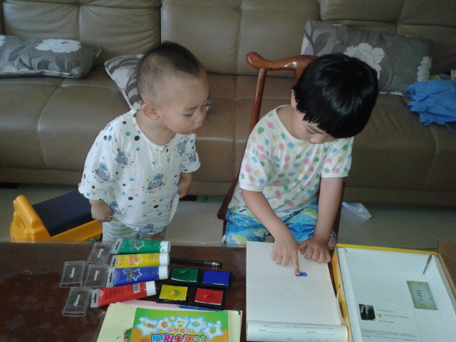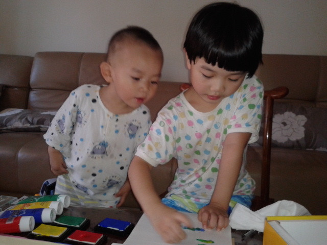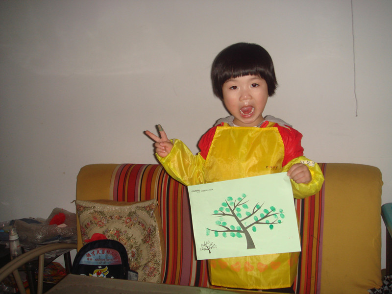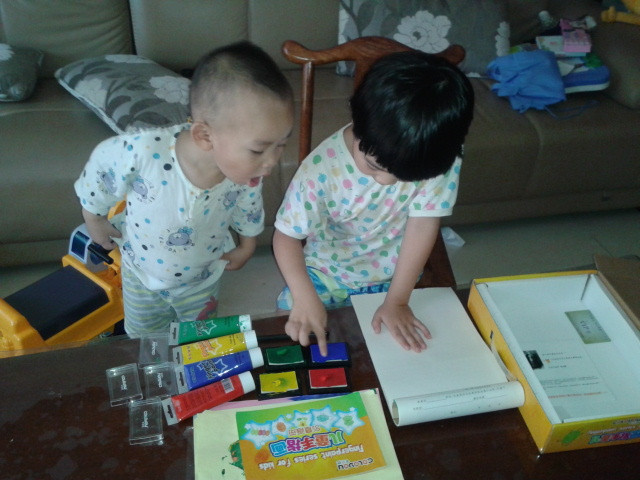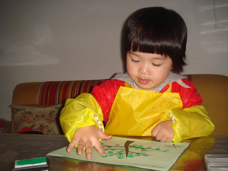 ![]() 先声明啊!这次画的手指画是暑假的时候画的,只是我一直没空上来发贴而已,现在才有时间发上来,所以孩子们都穿的短袖。 这套手指画的涂料还是前年买的,当时买回来后坨玩了几次,后来搬到这边来的时候,让我收在书柜上面,坨也没想起这个事情了,所以一直搁置着没玩,暑假的时候有天找东西的时候才发现的,这下坨就有得玩了,那段时间经常自己拿出来玩。 ![]() 这套手指画的颜料其实只有四种颜色,然后很多颜色如果需要的话都要自己调,其实挺不错的,能让孩子看到颜色的变化,然后还配了一本说明书,就是印了手指画后再加几笔就成了生动的小动物,或者其他小植物之类的,给孩子玩还是挺适合的,而且还配了围兜和袖套,不怕会弄脏自己。不过坨现在玩起来根本不用这些了,很会注意,一点不怕会弄脏自己,而且这种如果弄脏了也容易清理掉的。 ![]() 先挤颜料。颜料只有红黄绿蓝四种。 ![]() 挤了颜料就开始印了。 ![]() ![]() ![]() ![]() 是不是挺像毛毛虫啊? ![]() ![]() ![]() ![]() 上两张坨四岁的时候手指画吧! ![]() ![]() ![]() 完 本作品未经作者许可不得转载,转载请征求作者意见。擅自转载使用,将保留追究其法律责任的权利! 个性签名