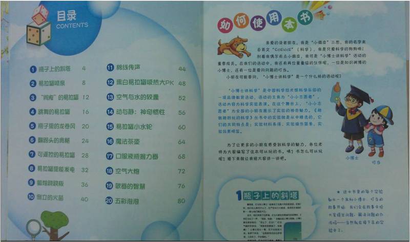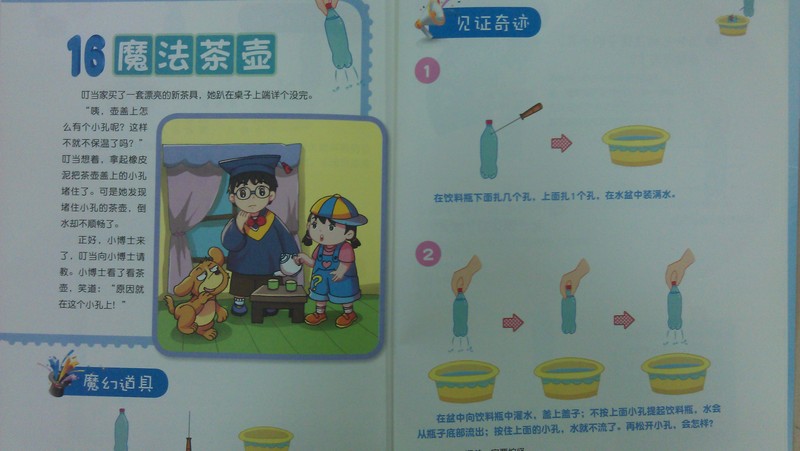 该书用到的实验器材都是家居常见事物,不用费时费钱费精力的特意购买,像易拉罐,饮料瓶,蜡烛,锥子,水盆,水舀子,线绳 啥的,在家随便翻翻就能搞到吧。有孩子以后,饮料喝完瓶子不能随便丢弃,化妆品用完罐子不能一扔了之,这些以往的破烂,要统统攒起来,以备不时之需,这不,等孩子兴高采烈要求做实验的时候,这些“破烂儿”就成了宝贝啦。 这本书的主人公有一男娃一女娃一狗狗,充分考虑到了小男孩小女孩两方面的兴趣所在!男孩是聪明博学戴眼镜的“小博士”,女孩是活泼可爱求知欲强的“叮当妹妹”,狗狗有个不太主流的名字叫“三思”,很特别吧,原来是“science”的音译啊,狗狗的大名都这么有学问,佩服一把! 下面小倩就以“16 魔法茶壶”给大家展示一下该书每个实验的用心编排吧: