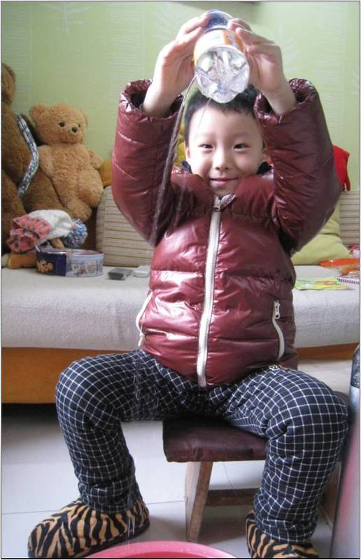 以下是真人秀啦,儿子玩得好happy! 堵住小孔,水不出来: