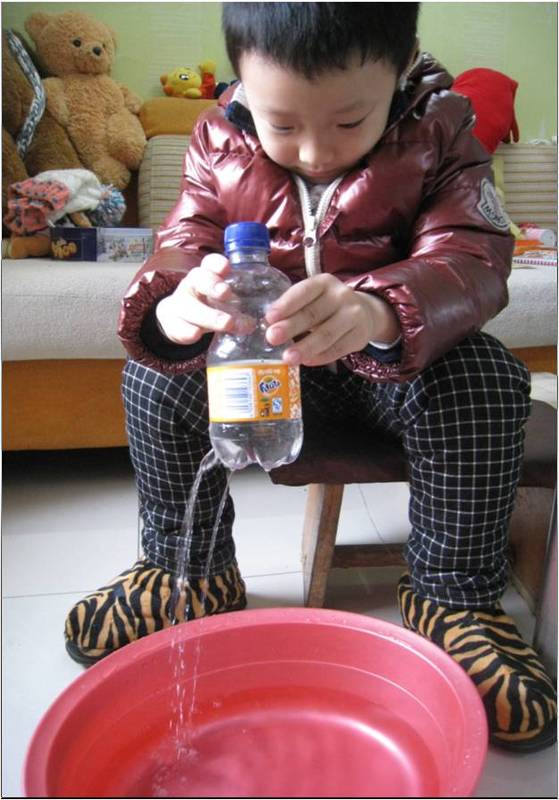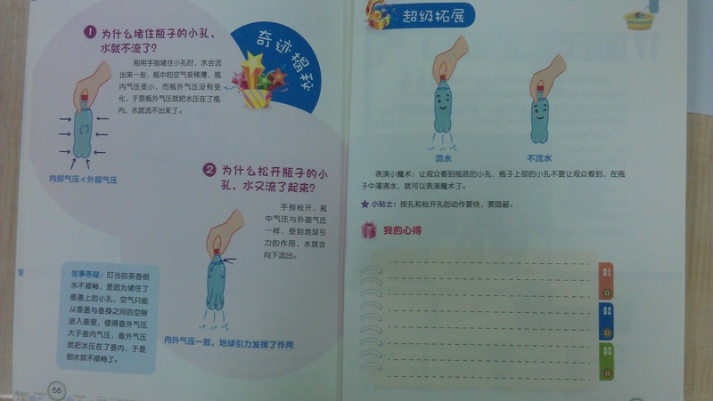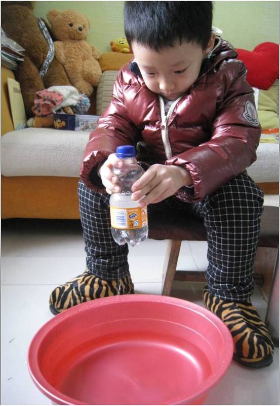 第一部分:先给孩子们讲一段发生在小博士,叮当妹妹生活中妙趣横生的小故事,从故事中提出问题。这一篇就讲了一段叮当妹妹家新买的茶壶似乎有魔法,堵住盖儿上的小孔,水就倒不出来了,这是什么原因呢,碰巧小博士来玩,他胸有成竹的给妹妹答疑解惑,生怕她不明白,还要给她演示一番。 第二部分:魔法道具 1. 饮料瓶。2.锥子。 3.水盆。 这三样儿家什平常普通吧,家家都有吧,唾手可得吧。 第三部分:见证奇迹 1. 在饮料瓶下面扎几个孔,上面扎一个孔,水盆中装满水。 2. 将饮料瓶灌满水,盖上盖子,不按上面小孔提起饮料瓶,水会从瓶子底部的小孔流出;按住上面的小孔,水就不流了。再松开小孔,水继续流。 还有个贴心的小贴士哦:瓶盖一定要拧紧。