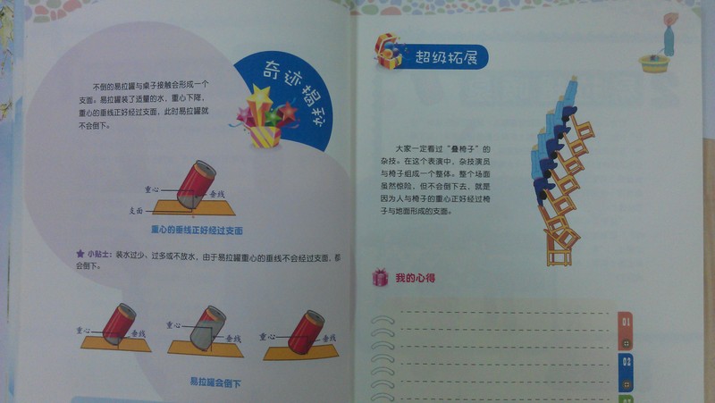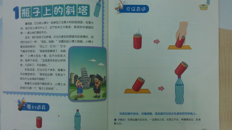 从目录来看,这本书一共有20个科学小实验,包括“瓶子上的斜塔”,“易拉罐喷泉”“闹鬼的易拉罐”“跳舞的易拉罐”“瓶子里的龙卷风”等等,翻来覆去的在易拉罐这样一个简单的道具上做文章,体现的科学道理可不简单,涵盖了“重心下降”“气体膨胀”“大气压强”“作用力与反作用力”“摩擦力”等诸多理论。如果每天做一个的话,也够玩整个暑假的了。因为实验太有趣,我相信每个孩子都会情不自禁的要求再做一个,再做一个!