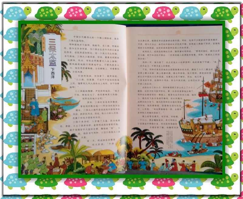 这本《11月的故事上》共讲述了十个小故事,有我所熟悉的《三保太监下西洋》、《韩非子说故事》中的买鞋的笨人、矛和盾、珍珠和盒子,还有我所不熟悉的《杨师傅雕龙记》、《螃蟹背上的牛蹄印》等等,拿过书我想先睹为快,可是小宝抢去了,她在哪里研究配画呢,在《三保太监下西洋》这个故事中,小宝看到画中好多人排着队有抬东西的有挑东西的,“他们这是干什么呀?”赶紧给宝宝解惑:“他们拿着这些东西去和别人交换呢,这样别人就知道咱们中国有这么多好东西了”看到三保太监郑和下西洋航线图时,小宝又不明白了,于是妈妈又充当了地理教师,给宝宝讲中国在哪里、印度、伊朗、阿拉伯等国家在哪里,让宝宝从小开始接受地理教育!
