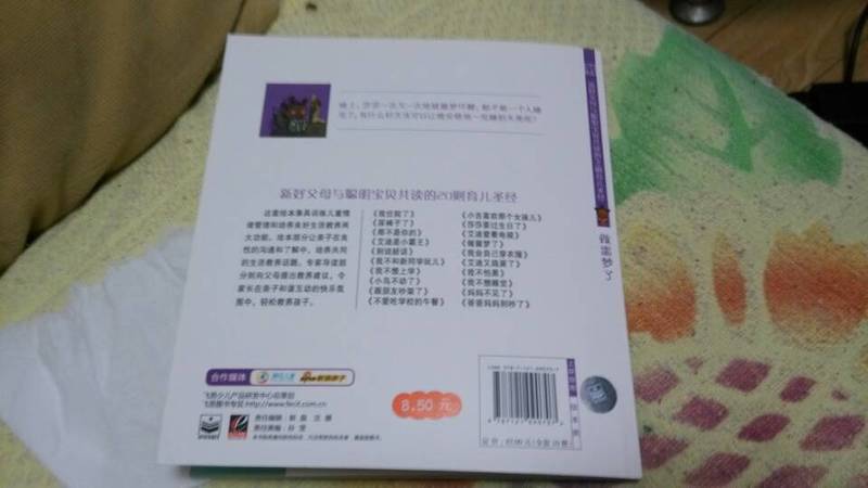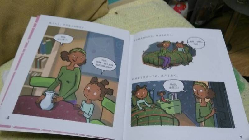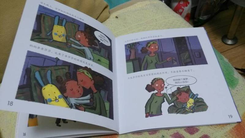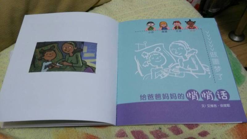 这本书是育儿圣经里面的一本,这是一套兼具训练儿童情绪管理和培养良好生活教养两大功能的绘本。绘本部分让亲子在良性的沟通和了解中,培养共同的生活教养话题。专家导读部分则向父母提出教养建议,令家长在亲子和谐互动的快乐氛围中,轻松教养孩子。 这套书涉及的主要人物是艾迪-调皮捣蛋酷小子,莎莎-害羞内向小女生,小吉-爱幻想的小男孩,露露-古灵精怪小女生。 在《做噩梦了》里面讲述的是小女孩莎莎的故事。现在就要我们一起来看看吧。晚上九点莎莎要上床睡觉了,莎莎在临离开客厅前还不忘问妈妈会不会来和她说晚安.莎莎躺在床上,妈妈坐在旁边,莎莎要求妈妈抱抱.妈妈亲了莎莎一下后,离开了房间,妈妈说,晚安,亲爱的.上床睡觉之前,莎莎妈妈想先看一会电视,突然,她听到莎莎在尖叫,于是赶紧跑进去.原来莎莎做噩梦了.莎莎把她做的噩梦说给妈妈听,妈妈尝试着安抚她.但是莎莎不要妈妈离开房间,于是妈妈与莎莎说好时间躺在旁边配着她,很快莎莎睡着了,妈妈悄悄离开房间.可是半夜莎莎又做噩梦了,跑到了妈妈的房间,想和妈妈一起睡,妈妈坚决地拒绝了.第二天早上,莎莎因为晚上没睡好,早上起来很不开心,才到学校,莎莎就很累了.疲惫的样子把老师都吓了一跳.老师跟莎莎妈妈说,这个年龄的孩子经常会做噩梦,老师在课堂上要小朋友讲述自己的梦境,下课后小吉给莎莎讲了自己为什么不再做噩梦的方法就是晚上跟大狗狗玩偶睡.于是莎莎在放学妈妈来接她的时候,把这个方法告诉了妈妈,妈妈带着她去玩具店,买了小兔子玩偶,有了小兔子的陪伴,莎莎真的睡得很安慰,不再被噩梦惊醒了.做噩梦的问题就这样解决了. 刚开始朵妈还有点担心这个故事会不会得到小妞的排斥,可是结果没想到,小妞很喜欢,而且在我给她讲的时候还不忘跟我说,她也有晚上陪着睡觉的玩偶哦,就是巧虎抱枕,每天晚上抱着,似乎真的对缓解噩梦有好处哦. 朵妈觉得这本书写的非常好,非常的贴近生活,而且人物语言也非常的熟悉,看着这本书,你会感觉自己就是书中的一分子.好的图书就是视觉和听觉的享受. 而书后半部分的写给家长的话也是非常实用,而不空洞,很容易理解接受.真的是非常不错的一套书. 我是分隔线,请欣赏图书![]() 做噩梦了 ![]() 晚上g该睡觉了,妈妈来和莎莎道晚安.莎莎一个人睡一个房间哦,你家宝宝一个人睡一个房间了么? ![]() 莎莎睡后,妈妈正子阿看电视,莎莎做噩梦了,要求妈妈陪着,妈妈陪睡后悄悄的走了 ![]() 结果莎莎到夜里又做噩梦了,折腾得没睡好,第二天很疲惫 ![]() 莎莎的同学分享自己抱着大狗就不再做噩梦的经验,于是莎莎和妈妈去买玩偶 ![]() 在小兔子的陪伴下,莎莎终于睡了安稳觉. ![]() 故事结束了,后半部分是给爸爸妈妈的悄悄话,涵盖的知识面很广 ![]() 封底 本作品未经作者许可不得转载,转载请征求作者意见。擅自转载使用,将保留追究其法律责任的权利! |