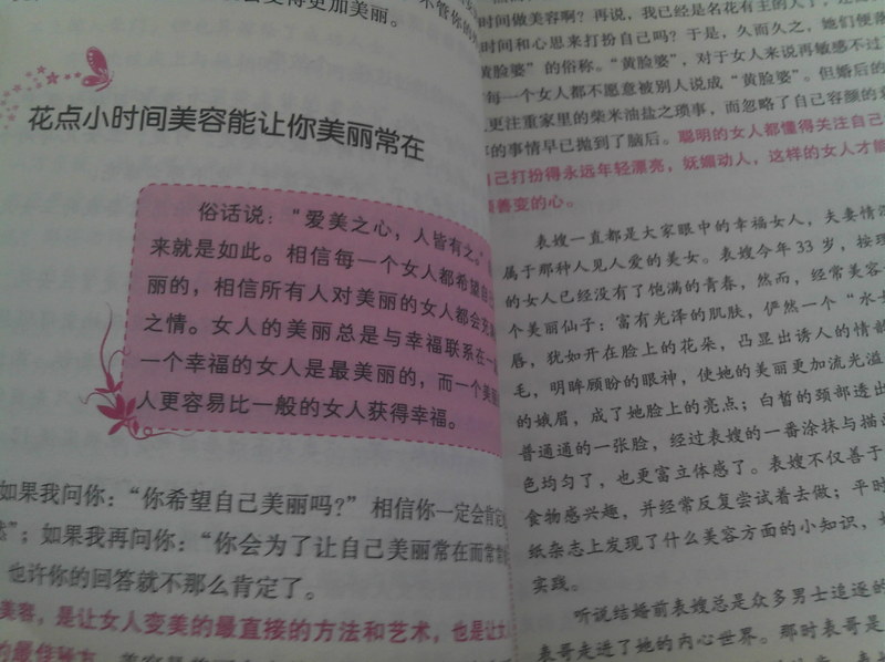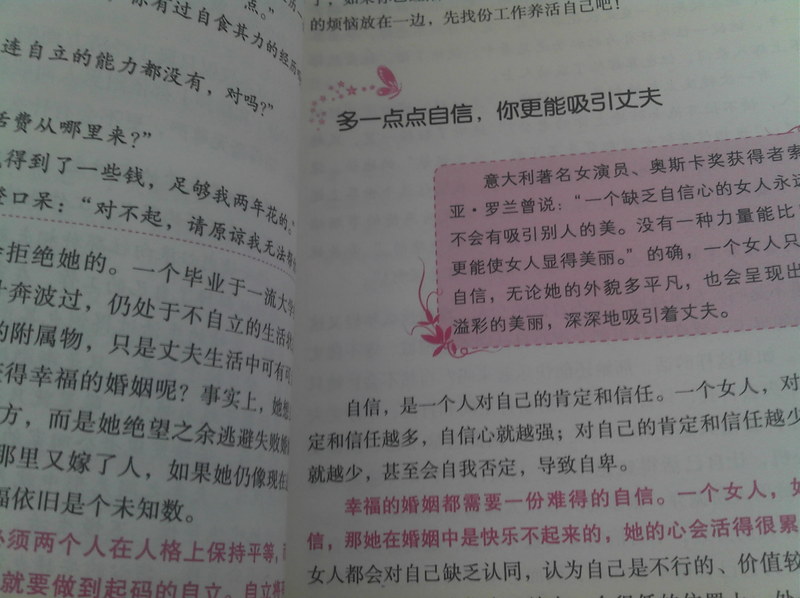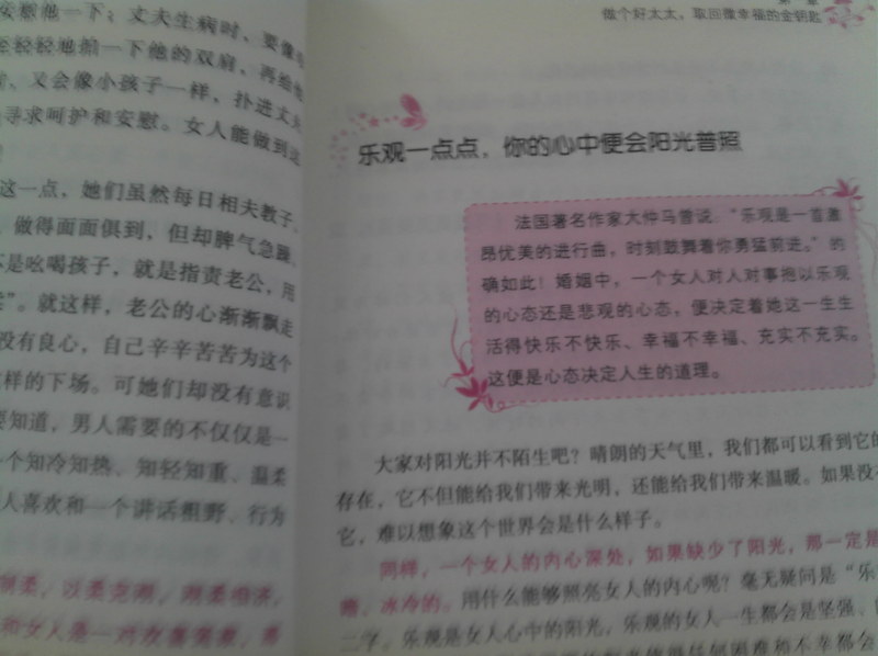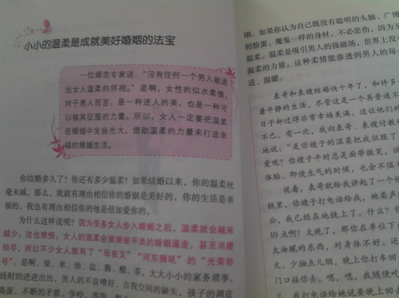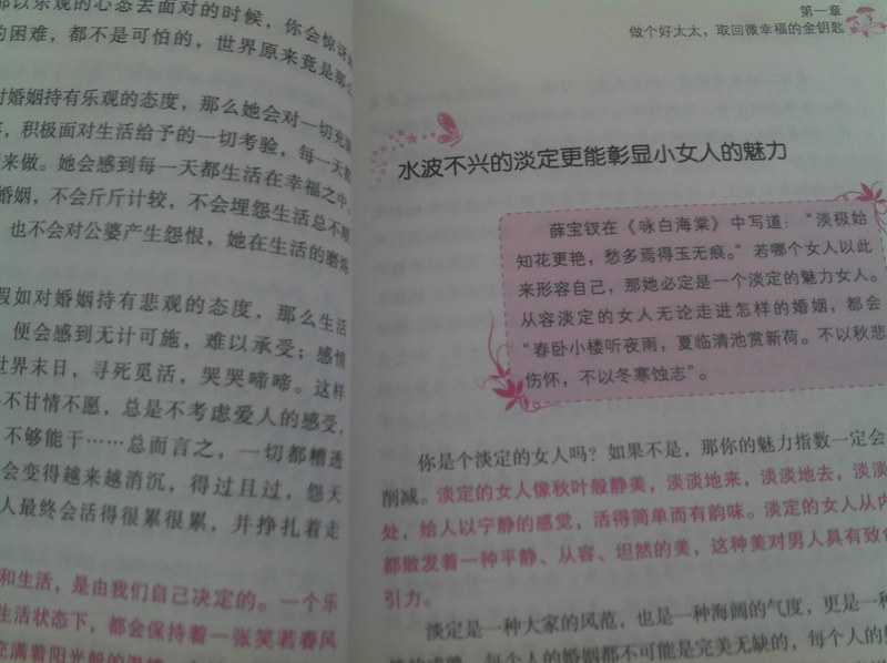 这本书教给我们,女人,一个结婚的女人应该具备温柔、乐观、淡定、善良、热情、自爱、自立、自信、美丽和持家的优良品格。看看还真是多啊,不禁感慨,对我们女人的要求也太多了吧,世界上哪有这么优秀这么完美的女人呢,是不多,不过作为芸芸众生中最普通的女人之一,为了我的婚姻幸福,我还是愿意努力,让自己成为这样完美的女人的,越接近越好,这一生都在努力着。 这们多项里面,我还真是缺的挺多的,除了善良、自爱、自立和持家这四项以外,其他的都或多或少的有欠缺,怪不得我的婚姻幸福指数不高呢,呵呵。