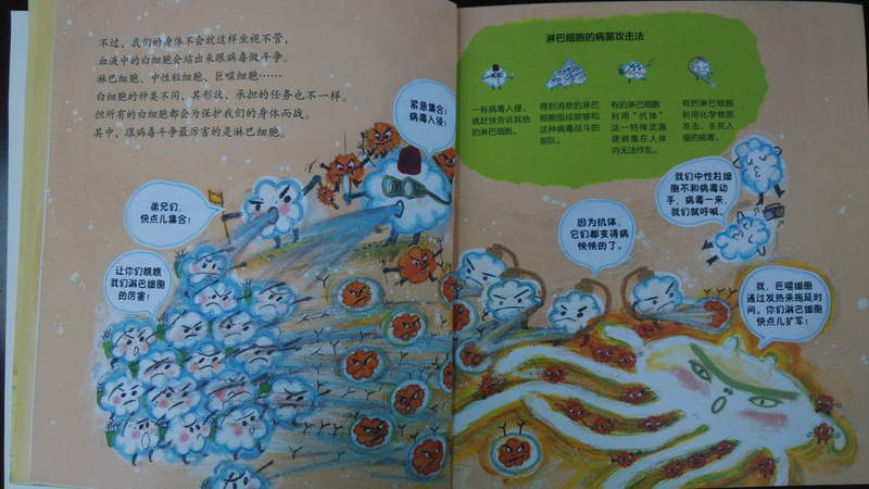 之所以会发炎,是因为小朋友得了病毒性感冒。书中也用了很有趣的图,生动地告诉了我们病毒入侵细胞的全过程。 不过,我们的身体有强大的免疫系统,对于病毒的入侵不会这样坐视不管的。以前,只知道白细胞和淋巴细胞可以杀死病毒。没想到,书中却将细胞做了进一步的细化,而且每种细胞的分工也在图中详细的说明。比如:中心粒细胞会告知病毒的入侵,召集淋巴细胞对抗病毒,而巨噬细胞通过发热来拖延了病毒入侵的时间,这也向我们解释了为什么生病会发烧。