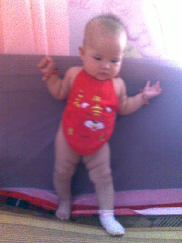 看穿一只袜子的齐宝,穿着外婆买的红肚兜,举起小手掌握着平衡,八个月的齐齐已经可以站立了