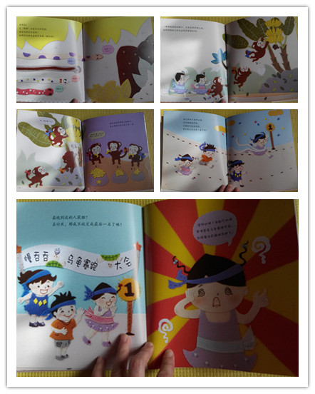 这边有四条蛇,它们谁会先到石头那里呢?哦,它们是按照先到达的先后顺序来排列的,第一个半圆,第二个点点,第三个三角形,第四个星星。 这里还有猴子,它们正在往香蕉树上跳,它们会谁是第一个呢?它们是按照爬到树上的先后顺利排列的,蓝色第一,橘色第二,红色第三。 吃香蕉的时候它们是按着谁吃的多和排列的,红色第一,橘色第二,蓝色第三,它是爬的最快吃的最慢。 她们也来参加比赛跑步了,妹妹心想她经任何人都跑的快,她一定能会得第一的,结果这是比赛是慢吞吞乌龟赛跑大会,所以妹妹得了倒数第一,而姐姐跑的最慢她却得了第一。 在这里应该让孩子们特别注意一下,以后无论是做什么事情都要先看清题目,这也让我想起来我们上学的时候,总是不仔细看题目,盲目去做,结果最后做错了,如果这次妹妹看到是乌龟赛跑我想她一定不会跑的那么快了,我也告诉盼盼以后不管做什么都要弄清楚是要干什么的,该怎么做,做成什么样。